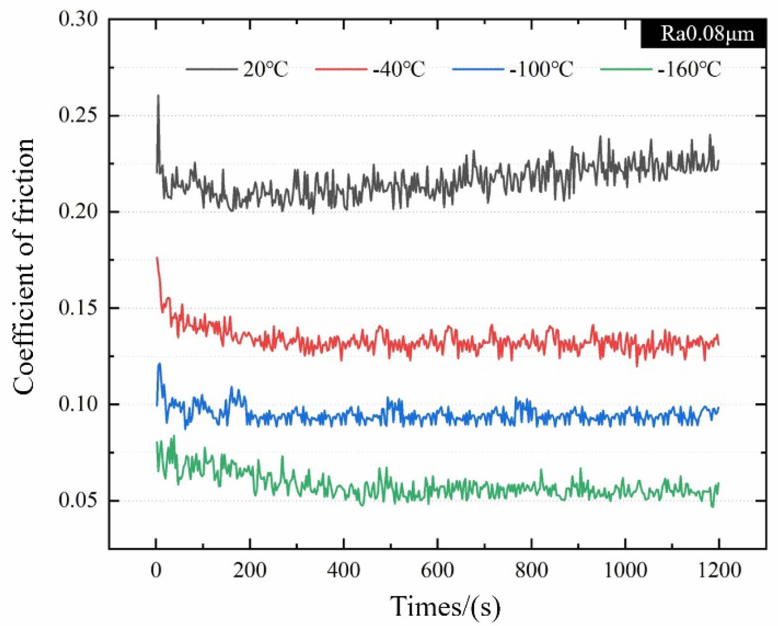 Figure 7 shows the variation law of friction coefficient between silicon nitride with surface roughness Ra 0.08 μm and PTFE under different temperature environments. It can be seen from the figure that the friction coefficient decreases with the decrease of temperature during the test. Under the condition of 20 ℃, the friction coefficient generally shows a gradually increasing trend, reaching the minimum value of about 0.2 near 180s. With the continuation of the test process, near 1200s, the friction coefficient gradually increases to about 0.23. When the test temperature condition is reduced from 20 ℃ to -40 ℃, the friction coefficient is reduced to about 0.13, with a reduction of about 43.5%. And under this temperature condition, with the increase of test time, the friction coefficient generally shows a relatively stable change law. When the test temperature is reduced from -40 ℃ to -100 ℃, the friction coefficient is reduced to about 0.09, with a reduction of about 30.8%. When the test temperature is reduced from -100 ℃ to -160 ℃, the friction coefficient is reduced to about 0.06, with a reduction of about 33.3%. At the same time, the overall variation law of the friction coefficient under the conditions of -100 ℃ and -160 ℃ is similar to that of the friction coefficient at -40 ℃.
