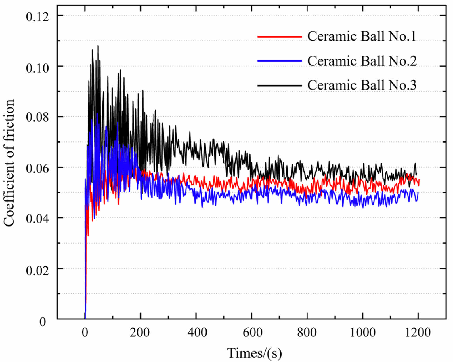Combined with the analysis of the phenomenon of large fluctuations in the friction coefficient in the early stage of the test, it can be seen that with the progress of the test, the decrease in the friction coefficient may be due to the formation of a transfer film by PTFE wear debris during the friction and wear process, which improves the lubrication performance between the friction pairs. The friction coefficient of the friction pair of ceramic balls with a surface roughness of Ra 0.32 μm fluctuates greatly in the early stage, and the running-in time is also much longer than that of ceramic balls with Ra 0.16 μm. It can be concluded from the above analysis that when processing the surface roughness of ceramic bearing components, a lower surface roughness value is not necessarily more conducive to the frictional contact between components.