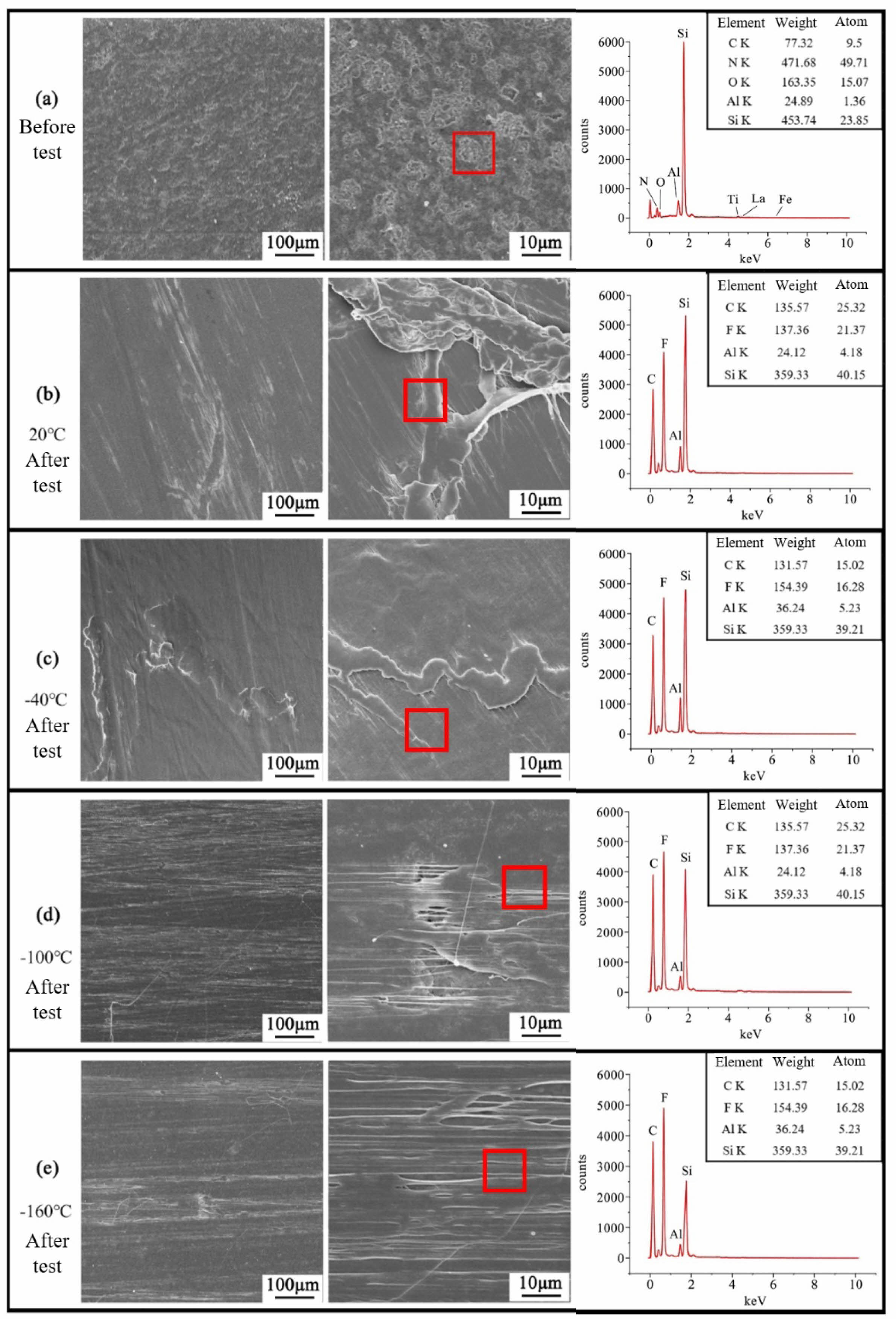 Figures 11(d) and 11(e) present the surface morphologies of the silicon nitride ball after tests under -100 °C and -160 °C conditions. As shown, with the further decrease of the test temperature, the PTFE transfer film still forms on the silicon nitride surface, but its morphology differs from that under 20 °C and -40 °C. The lower the temperature, the more uniform the transfer film becomes. Elemental analysis reveals that as the friction test temperature decreases, the relative contents of F and C elements are both lower than that of Si. This indicates that with the decrease in ambient temperature, the PTFE transfer film in the form of large agglomerates gradually disappears, and the content of filamentous transfer film relatively increases.
