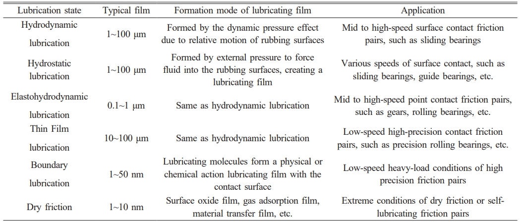 For rolling bearings operating under low-temperature conditions, the main low-temperature media include liquid hydrogen (LH2), liquid oxygen (LO2), liquid nitrogen (LN2), and liquid helium (LHe). The viscosities of these cryogenic fluids are all less than one-fourth of that of water [7, 8]. Therefore, it is difficult to establish an effective hydrodynamic lubrication film between the relatively moving surfaces of the bearings. Under these conditions, the low-temperature fluids can only serve to remove some of the frictional heat, with little impact on the lubrication between bearing components [9, 10]. The purpose of bearing lubrication is to form a lubricating film between two surfaces in relative motion. This film can support normal loads and reduce shear strength in the tangential direction, thereby providing significant lubrication between the friction pairs. Lubrication states can be categorized into six basic types: hydrodynamic lubrication, hydrostatic lubrication, elastohydrodynamic lubrication, thin-film lubrication, boundary lubrication, and dry friction [11, 12]. The formation mechanisms and application scenarios for each lubrication state are shown in Table 1. Under low-temperature conditions, traditional lubricants (oils or greases) solidify and fail, disrupting the friction contact and lubrication medium between bearing components [13]. As a result, the lubrication of bearings is mostly in the form of dry friction, relying on solid lubricating materials to provide lubrication. Due to the limitations of low-temperature media and temperature, bearings cannot use oil or grease lubrication. Therefore, bearings mainly depend on the solid lubricating properties of the cage material to provide lubrication [14-16].
