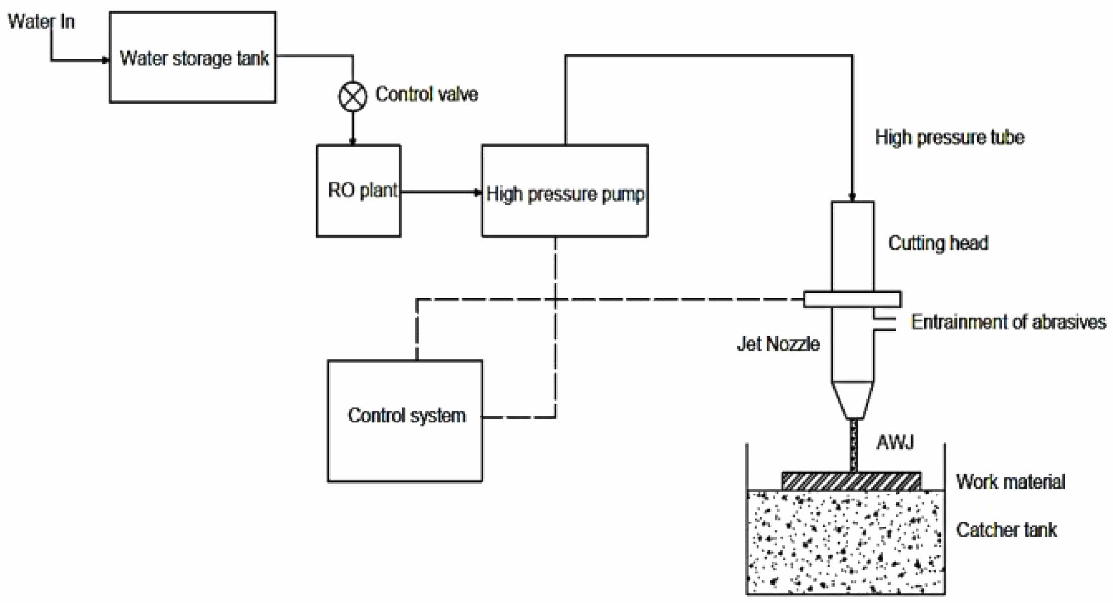 MONEL K500 is an age-hardenable Nickel-Copper alloy high strength corrosion fatigue and erosion resistance. Monel K500 finds applications in chains, cables, fasteners, springs, chemical processing, impellers, shafts, valves etc., This alloy is virtually non-magnetic at low temperatures and can be made slightly magnetic by leaving a nickel rich film on the outside of the material during heating. Low magnetic permeability, high strength and corrosion resistance are the prominent properties of MONEL K-500. Monel K-500 is often age-hardened and sensitive to thermal effects. AWJM’s reduces rework and preserves mechanical properties. Since the tool wear are highly controlled and tooling issues are reduced, AWJM is more feasible for industrial applications bringing economic production. There is no heat affected zone and no microstructural changes are found since AWJM is a cold cutting process. AWJM can produce high strength for intricate shapes with minimal machining. The material used in this experiment is Monel K-500 super alloy of dimension 100 mm×50 mm×15 mm. The chemical composition of MONEL K-500 is shown in Table 1. A typical schematic layout of abrasive water jet machining is given in Fig. 1.