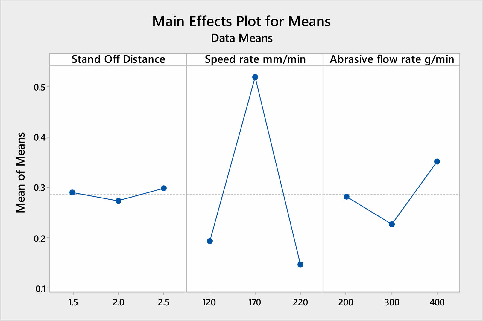 The ANOVA analysis for Kerf is carried out and it is observed that stand off distance and abrasive flow rate are the high influencing parameter in minimizing the kerf while machining MONEL K500 and it is followed speed rate. The R-square value of the ANOVA analysis is found to be 88.52% and it is highly acceptable. The ANOVA tables of surface roughness, material removal rate and Kerf are presented in Tables 4-6 respectively. R-square value represents the proportion of the response variability with respect to the factors and interaction of the factors considered as the process parameters in AWJM. 80-85% of R-square value denotes process variability can come from minor changes in the abrasive quality, environmental changes, measurement errors, vibration and so on. This value also depicts the model is highly significant and acceptable. The main effects plots for means for SR and MRR are shown in Fig. 2 and Fig. 3. respectively.
