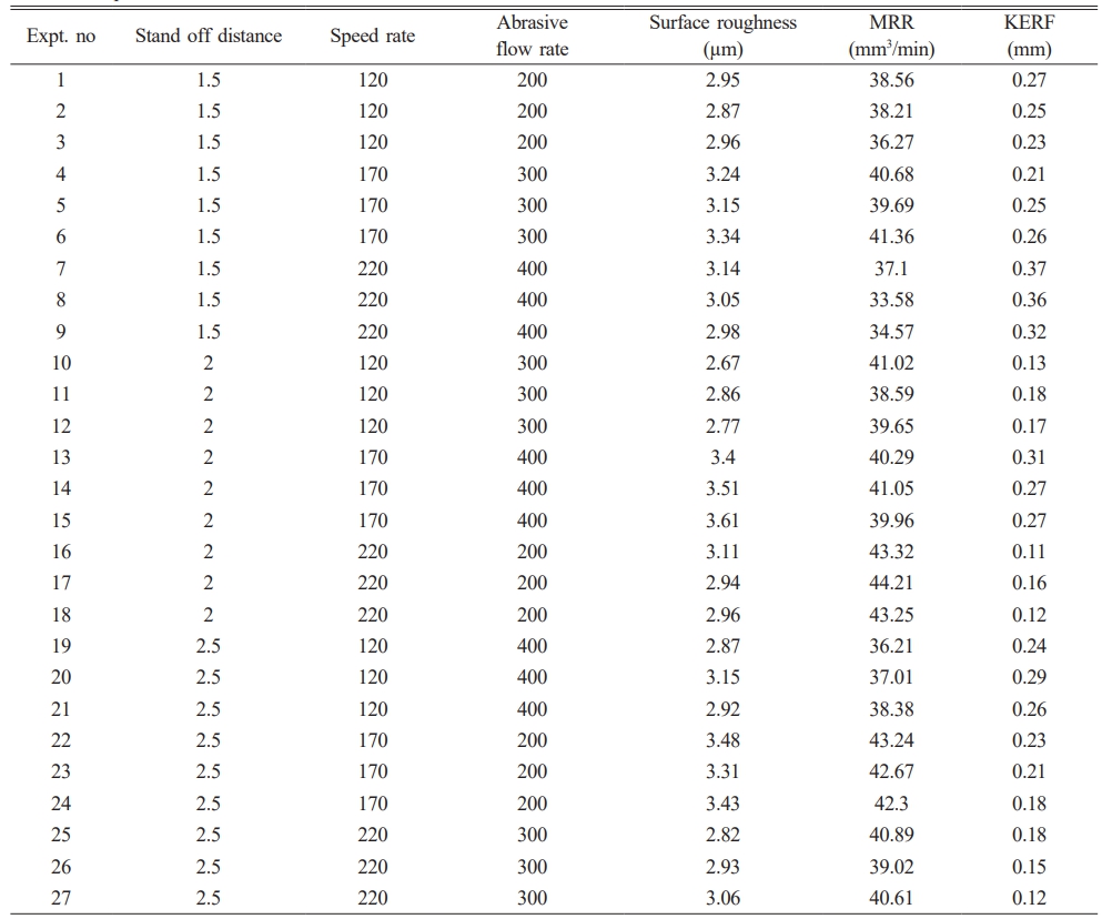 The responses such as surface roughness, material removal rate and kerf width are measured against these process parameters and recorded. Design of experiments is used to conduct the experiments with three process parameters and three levels, the L27 orthogonal array is selected to conduct the experiments at several combinations. Experiments are conducted and SR, MRR and kerf are measured at each experiment and recorded as presented in Table 3. The MRR is calculated by determining the weight difference of the material before and after machining. The Mitutoyo surface roughness tester is used to measure SR after machining the work material and three values are recorded and the average of this is recorded as the final surface roughness value after machining MONELK500.