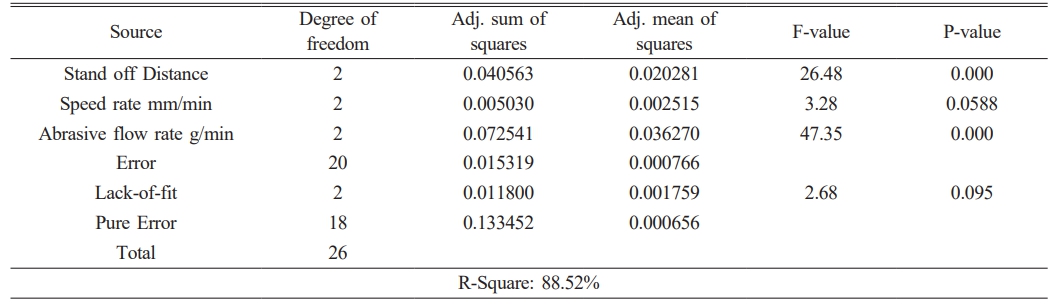 ANOVA analysis is useful in predicting the influence of the process parameters on the quality characteristics. F-value and p-value are used to study the significance of the process parameters on the response variables. In this work ANOVA analysis is carried out for all response to determine the dominant process parameters on machining of MONEL K500 using abrasive water jet machining. The ANOVA analysis for SR is carried out and it is observed that speed rate is the high influencing parameter in minimizing the surface roughness while machining MONEL K500 and it is followed with Abrasive flow rate and stand off distance. The R-square value of the ANOVA analysis is found to be 87.78% and it is highly acceptable. The ANOVA analysis for MRR is carried out and it is observed that stand-off distance, speed rate and abrasive flow rate are the high influencing parameter in maximizing the material removal rate for machining MONEL K500. The R-square value of the ANOVA analysis is found to be 85.35% and it is highly acceptable.