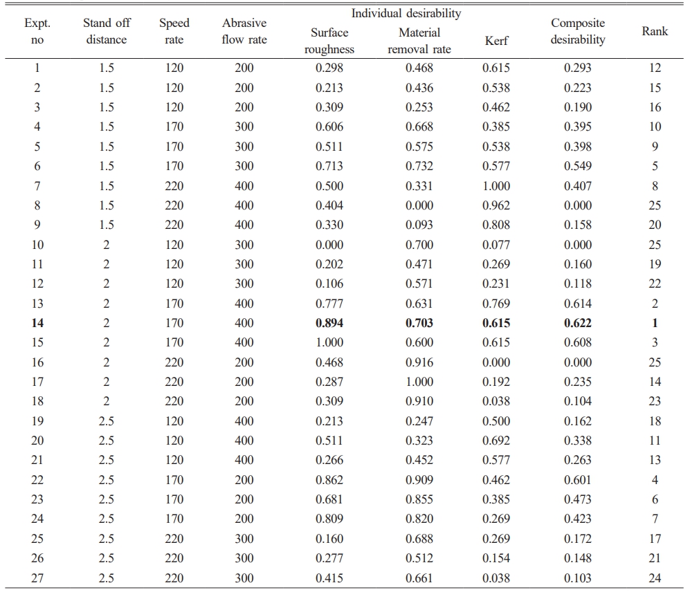 The individual desirability function for the SR, MRR and kerf are determined by assigning equal weightage to all the responses equally. Giving equal weightage to all the responses means, no single response is prioritized at the expense of the other. It provides a neutral optimization application allowing customization for all industrial applications. The composite desirability can be obtained without any bias by providing equal weights to all the responses. The composite desirability is computed and the optimum cutting parameters are determined. The higher the composite desirability, the better the quality conditions and it gives the optimal machining conditions. From Table 7, the higher composite desirability value is found to be 0.622 and the parameters against this value will provide the best optimum results. The values of composite desirability are ranked and higher the composite desirability, the value is ranked as ‘1’. The optimum input parameters for machining of MONEL K500 in abrasive water jet machining are computed as, standoff distance = 2 mm, speed rate = 170 mm/min and abrasive flow rate = 400 g/min. The composite desirability obtained for this combination is 0.622 and with these optimum levels, the surface roughness = 3.51 µm, material removal rate = 41.05 mm3/min and kerf = 0.23 mm. The validation of these parameters are performed and presented in Table 7.