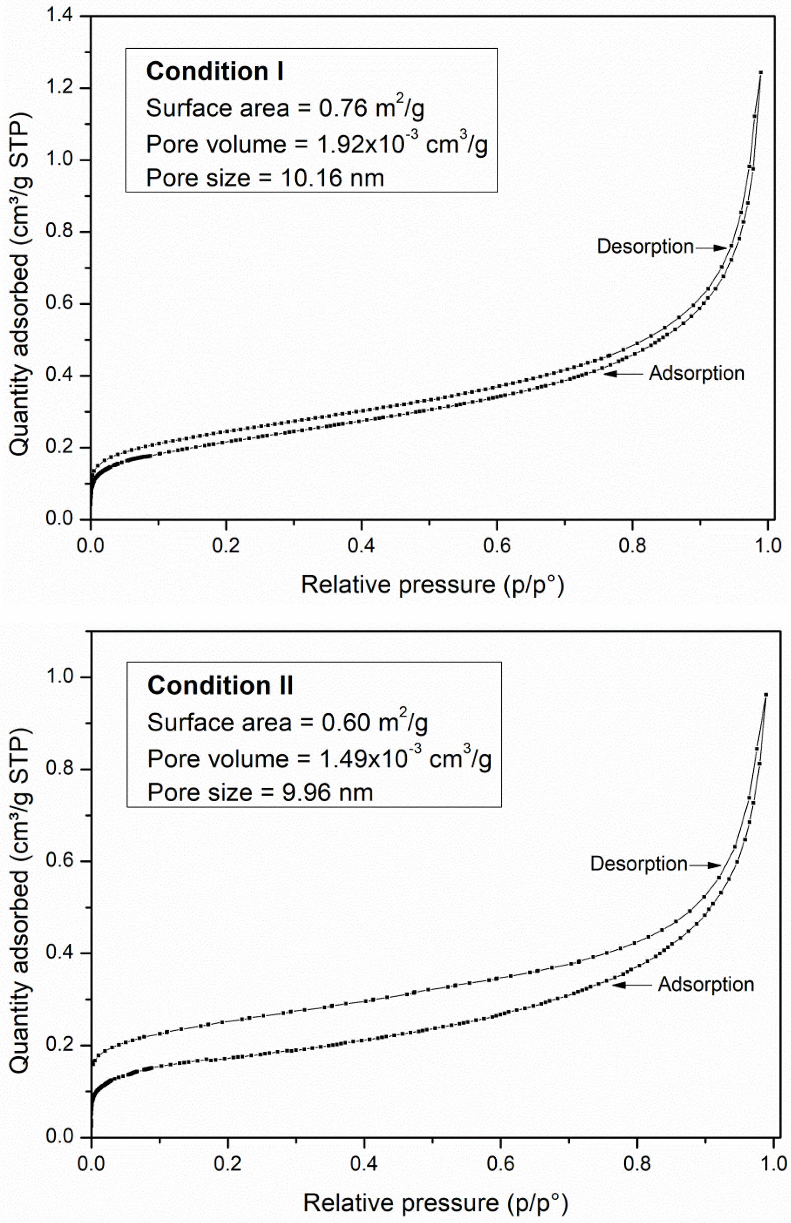 N2 adsorption and desorption isotherms were analyzed to determine the pore volume and pore size data of the NiFe2O4 ceramics sintered under both conditions. The isotherms exhibited hysteresis loops during the desorption process and were classified as type IV isotherms (Fig. 8). The disparity between adsorption and desorption is a phenomenon characteristic of ink-bottle-shaped pores, where some gas has difficulty escaping through a narrow neck during desorption. The narrower loop observed in condition I is indicative of delayed capillary condensation during adsorption [22]. According to IUPAC references, type IV isotherms are characteristic of mesoporous adsorbents with a pore diameter larger than 4 nm [22]. The results indicated pore sizes of 10.16 nm and 9.96 nm for ceramics sintered in conditions I and II, respectively, strongly confirming the isotherms type and the mesoporous nature of both ceramics. In addition, the NiFe2O4 ceramic sintered under condition I exhibited a larger specific surface area (0.76 m2/g) compared to condition II (0.60 m2/g), which can enhance gas absorption and positively impact the gas response. Although the specific surface area of the obtained NiFe2O4 ceramic is relatively low, the response to LPG gas also depends on surface defects, including oxygen vacancies and cation disorder associated with their magnetic ordering. These defects can serve as active sites for gas adsorption, thereby facilitating surface redox reactions that drive the sensing signals [35].