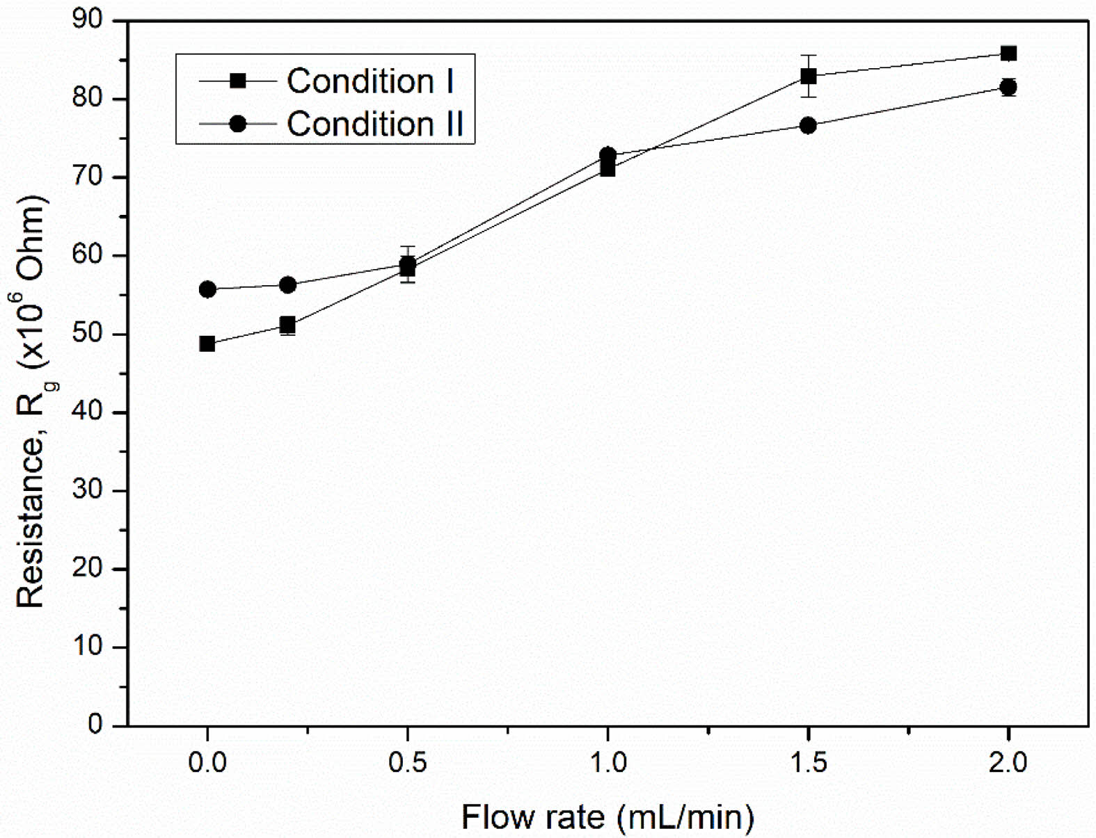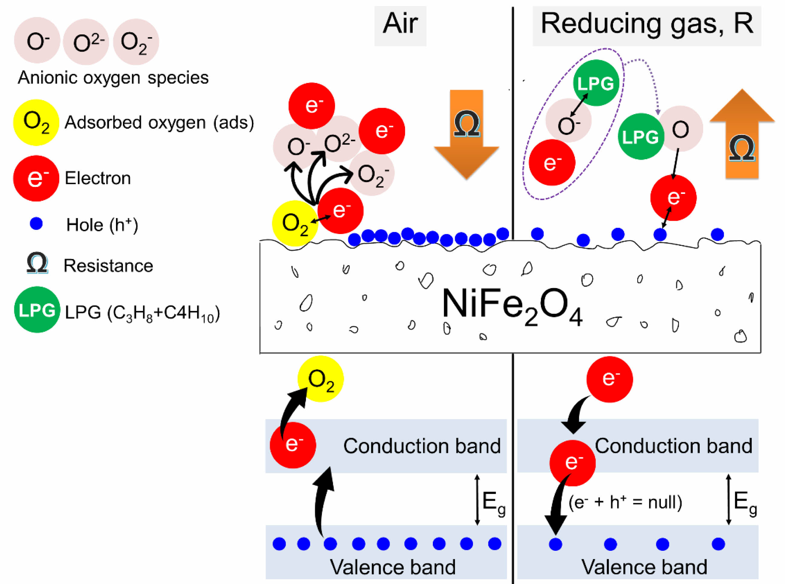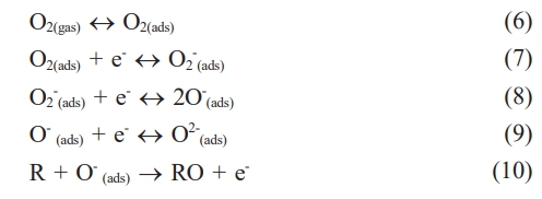 The room temperature resistance (Rg) of both NiFe2O4 ceramics was characterized by exposure to LPG at various flow rates. It was found that the Rg of both ceramics increased with the LPG flow rate (Fig. 9). The increase in resistance under reducing LPG exposure indicated that both NiFe2O4 ceramics should be classified as p-type MOS, where holes (h+) are the main conductive charge carriers. Changes in the resistance of the sensor can be explained by a surface-controlled process mechanism, as described in reactions (6) - (10), along with the schematic shown in Fig. 10. In air, oxygen molecules (O2(gas)) are most readily adsorbed (O2(ads)) on the surface of the NiFe2O4 sensor through physisorption (reaction (6)). The adsorbed oxygen molecules are ionized to form various anionic oxygen species (O2−, O−, or O2−) by capturing localized free electrons (e-) near the surfaces of NiFe2O4 molecules (reactions (7)-(9)). Meanwhile, the number of holes (h+) on the sensor surface increases as electrons are excited out of the valence band, and resistance decreases. Upon exposure to a reducing gas (R), such as LPG, the oxidation process between R and the negative oxygen species (reaction (10)) causes capped electrons to be released back to the sensor surface. The electrons insert into the valence band, recombining with holes, and the reduced number of holes leads to an increase in resistance [23-27].