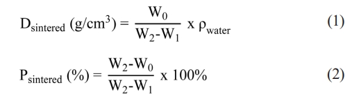 Based on Archimedes’ principle, NiFe2O4 ceramics were soaked in boiling distilled water for 5h and then immersed in distilled water at room temperature for an additional 8h. Afterwards, the ceramics were hydrostatically weighed with a precision analytical balance (Sartorious, B5A224S-CW). The sintered density and apparent porosity of the NiFe2O4 ceramics were calculated according to Eq. (1) and (2) [17]: