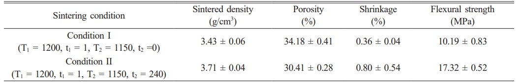 The microstructures of the NiFe2O4 ceramics from different sintering conditions were observed using SEM (Fig. 6). The SEM images revealed that the average grain size of the ceramic sintered under condition I was 0.86±0.06 µm, while the average grain size of the ceramic sintered under condition II was 1.26±0.15 µm. In condition I, there was no holding time for step 2 (t2=0), which prevented atomic diffusion, thereby suppressing grain growth and resulting in a smaller grain size. The sintered density, porosity, shrinkage and flexural strength of the sintered ceramic samples are listed in Table 1. The NiFe2O4 ceramic from condition II, which was sintered with a t₂ = 240 min, exhibited a higher flexural strength (17.32±0.52 MPa) than the NiFe2O4 ceramic from condition I (10.19±0.83 MPa). Although sintering under condition II increased the grain size, the high sintered density (3.43±0.06 g/cm3) of this ceramic was accompanied by a lower porosity (30.41 ± 0.28% compared with 34.18 ± 0.41%) and an increase in shrinkage (0.80±0.54% compared with 0.36±0.04%) that played major roles in enhancing the flexural strength of the ceramic.