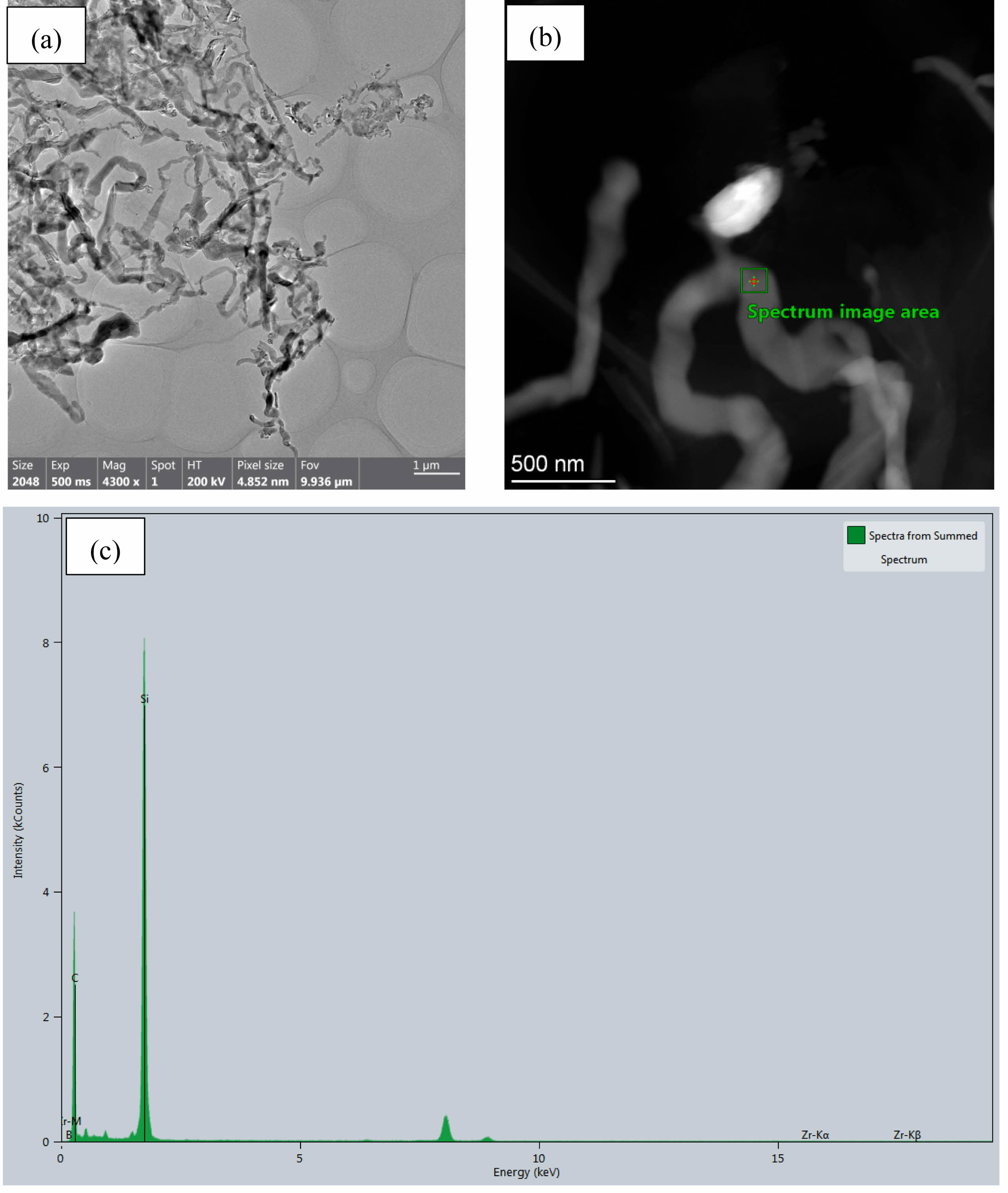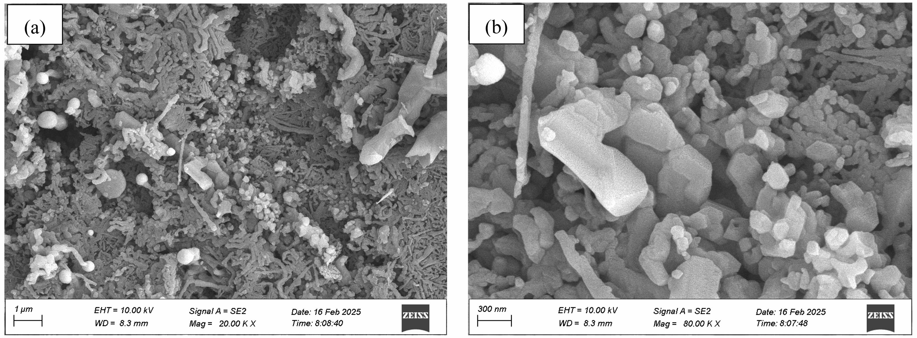 Fig. 2 presents SEM micrographs of the composite powders synthesized at 1600 °C for 1 h under argon, revealing a heterogeneous microstructure comprising quasi-spherical particles (50-150 nm), columnar particles, irregular aggregates, and abundant whisker-like features (~50-100 nm diameter). Complementary TEM analysis (Fig. 3) further elucidates these whiskers as slender, curved structures exhibiting distinctive bamboo-joint morphology, often forming interconnected networks. Based on characteristic carbothermal reduction pathways [21-24] and concomitant EDX analysis (Fig. 3c), these whisker-like features are conclusively identified as silicon carbide (SiC).