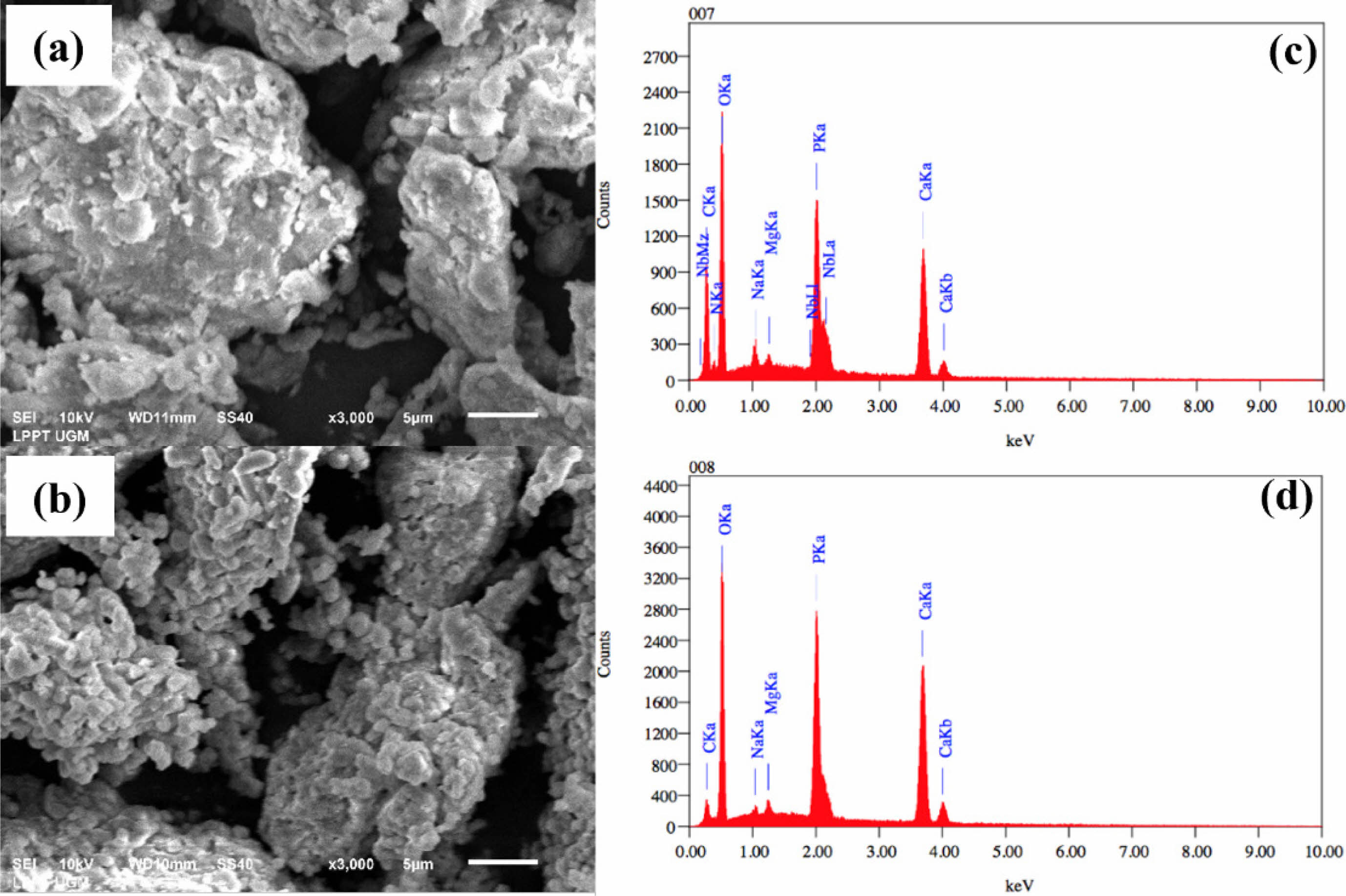 Figure 1(a-b), based on SEM result, shows that the particles in the sample are not spherical. Their arrangement and spacing are irregular, and they exhibit a range of sizes and crystalline forms. Fig. 1(c-d) presents the energy dispersive X-ray spectroscopy (EDX) test results, which are summarized in Table 1. The EDX test results indicate the components present in the material. In addition to calcium and phosphate, the main components of hydroxyapatite and other elements, such as magnesium and sodium, were also observed. Magnesium and sodium in the samples are inorganic elements commonly found in natural bone, specifically in buffalo and human bones. The wavenumber range from 4000 cm-1 to 1400 cm-1 is dedicated to identifying functional groups corresponding to stretching vibration absorptions for structural elucidation. The region beyond the 1400 cm-1 wavenumber is known as the fingerprint region, as each organic compound exhibits unique absorption characteristics in this area.