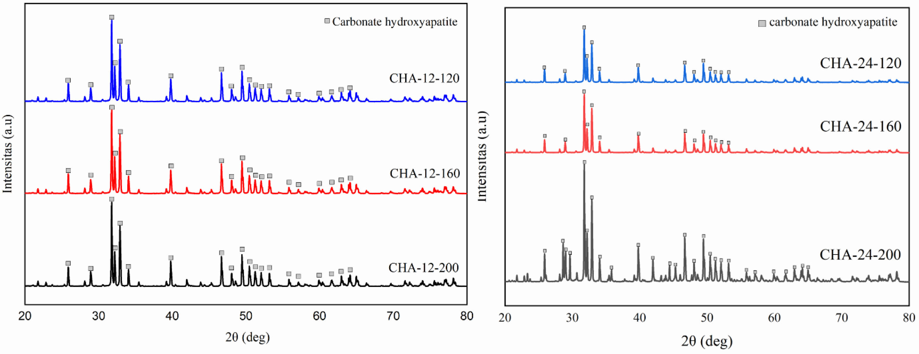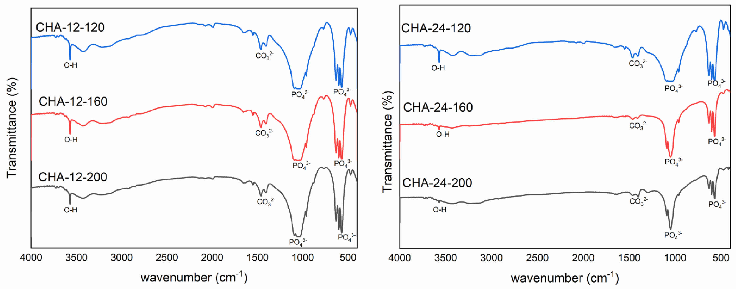 The FTIR analysis confirmed the presence of type B carbonate substitution in all CHA samples. Higher hydrothermal temperatures are known to favor type B substitution (carbonate replacing phosphate groups) over type A (carbonate replacing hydroxyl groups), as type B is thermodynamically more stable at elevated temperatures. Increasing temperature facilitates lattice rearrangement and enhances carbonate ion incorporation into phosphate sites.
