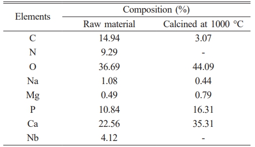 Figure 2 shows the FTIR spectrum of raw material and calcined at 1000 °C. Functional group analysis qualitatively identifies the components of buffalo bone through transmission absorption generated by FTIR. The raw material spectrum shows numerous and complex peaks, indicating the presence of various organic components within the bone.