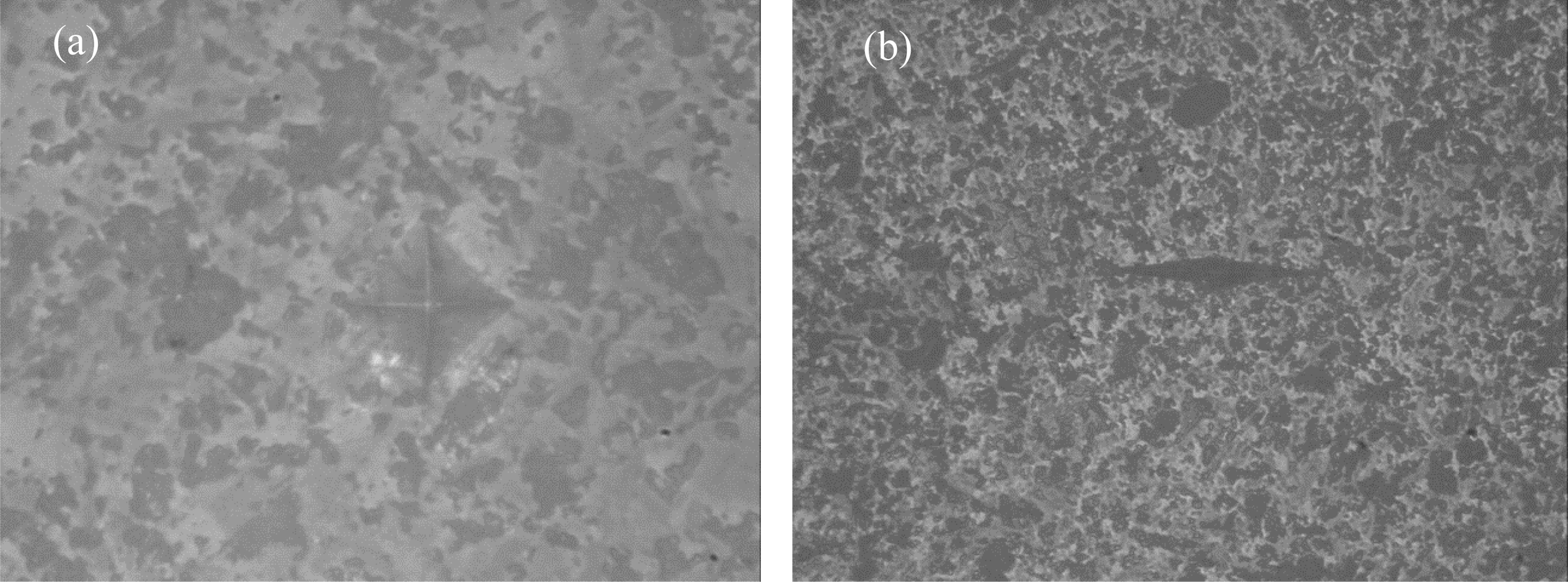 Fig. 5 Indentation of microhardness of 50AM-50ZY composite ceramics with two stage sintering of TS-3 condition (a) Vickers (b) Knoop. |