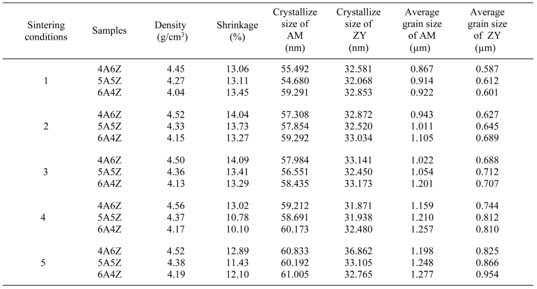 Table 1 The densities, percentage of shrinkage, crystallize size and average gain size of (100-x)AM-xZY (x = 40, 50, 60) composites ceramic with different sintering condition. |