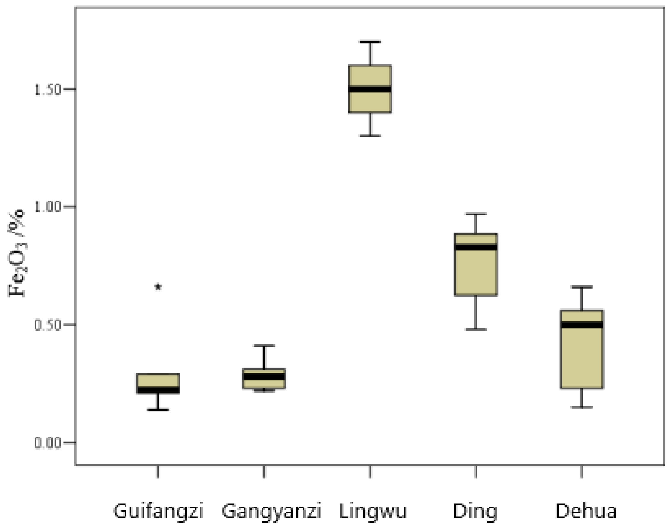 Fig. 3 Box plot of Fe2O3 content in the white porcelain bodies from Guifangzi and Gangyanzi. |