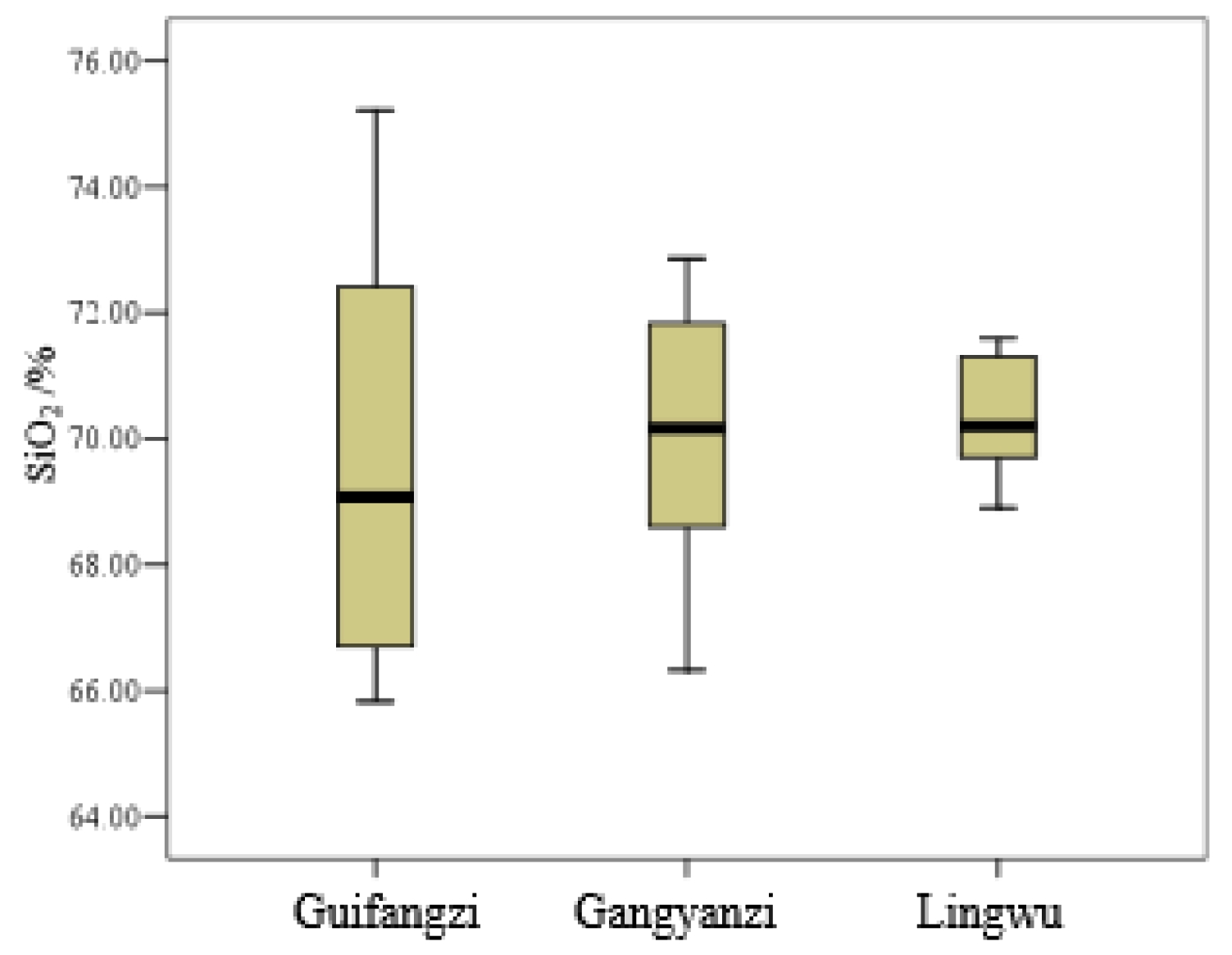 Fig. 4 Box plot of SiO2 content in white porcelain glaze of Guifangzi, Gangyanzi, and Lingwu kilns. |