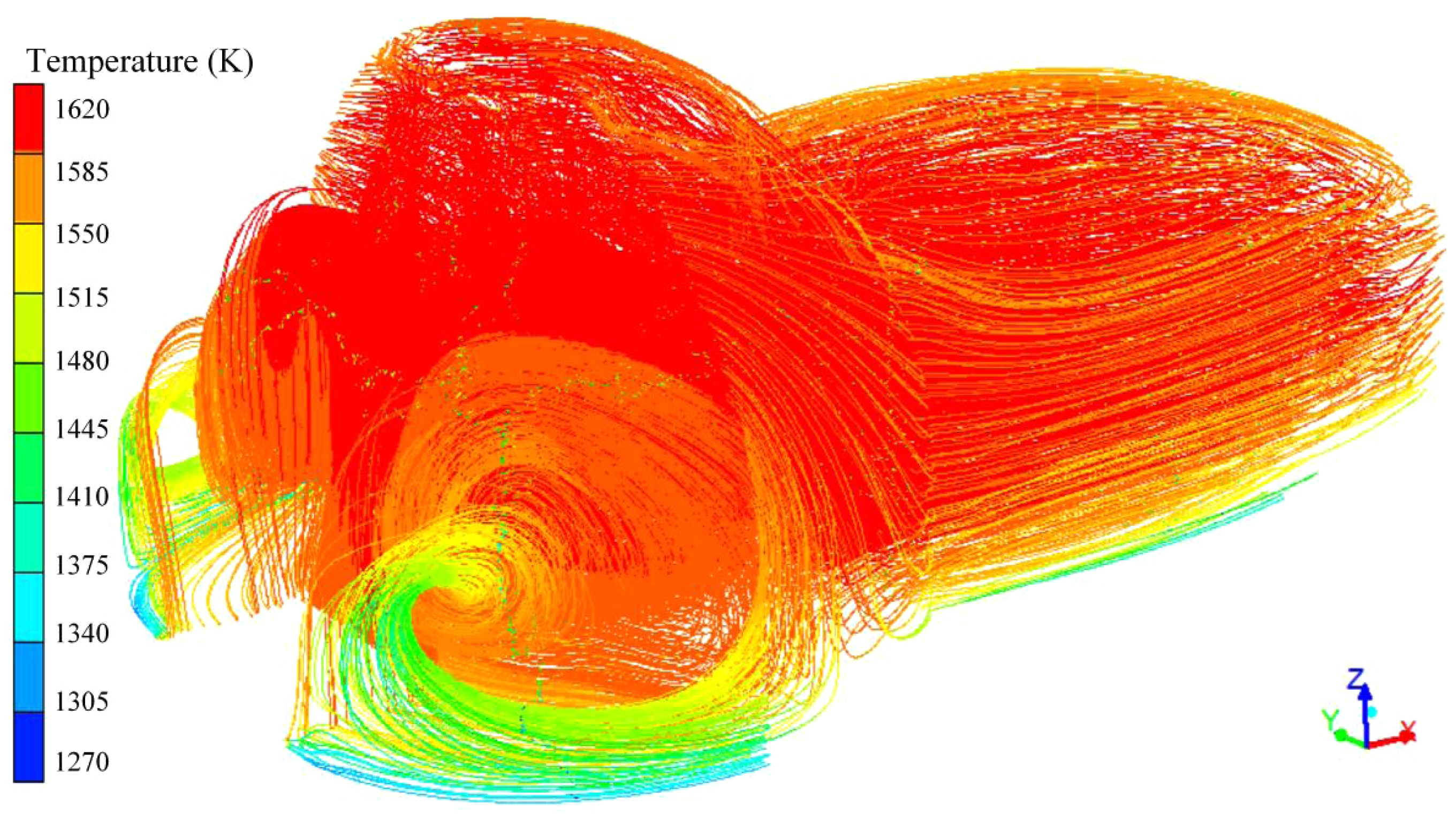 From the temperature streamlines in Fig. 4, it can be observed that the high-temperature flue gas entering the kiln initially rises to the top due to the buoyancy of hot air. Influenced by the unique gourd-shaped arch structure of the gourd-shaped kiln, a large amount of high-temperature flue gas gathers at the top of the front chamber, forming a high-temperature zone at the kiln top, with the highest temperature occurring at the arch of the front chamber. Due to the buoyancy of the high-temperature flue gas, it flows upward, causing the overall upper temperature of the kiln to be higher than the lower temperature, ultimately resulting in a temperature difference between the upper and lower parts of the kiln.