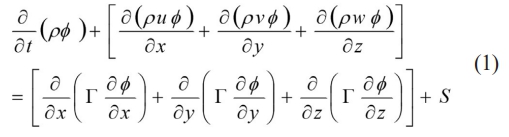where Φ is a common variable; Γ is the generalized diffusion coefficient; S is the generalized source term; and u, v, and w are the velocity components of the velocity of the mass in the microelement in the x, y, and z directions.