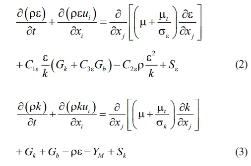 The k-ε turbulence model was one of the first turbulence models to be proposed, and it is widely used. It has been widely validated and recognized in industry and academia to have high reliability. The reasons for selecting this model for this paper mainly include its maturity and wide application, its computational cost and efficiency, its applicability and accuracy, its numerical stability and robustness, and its theoretical foundation and extensibility. When computing turbulence, the standard turbulence calculation model is utilized, where the turbulence kinetic energy equation (k equation) and the dissipation rate equation (ε equation) [34] can be expressed as follows: