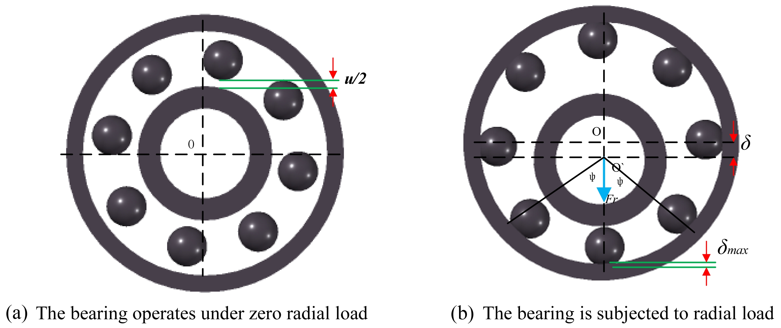 Figure 1 shows the deformation of the bearing under radial load. As seen in Fig. 1(b), the bearing undergoes vertical displacement when subjected to radial load: