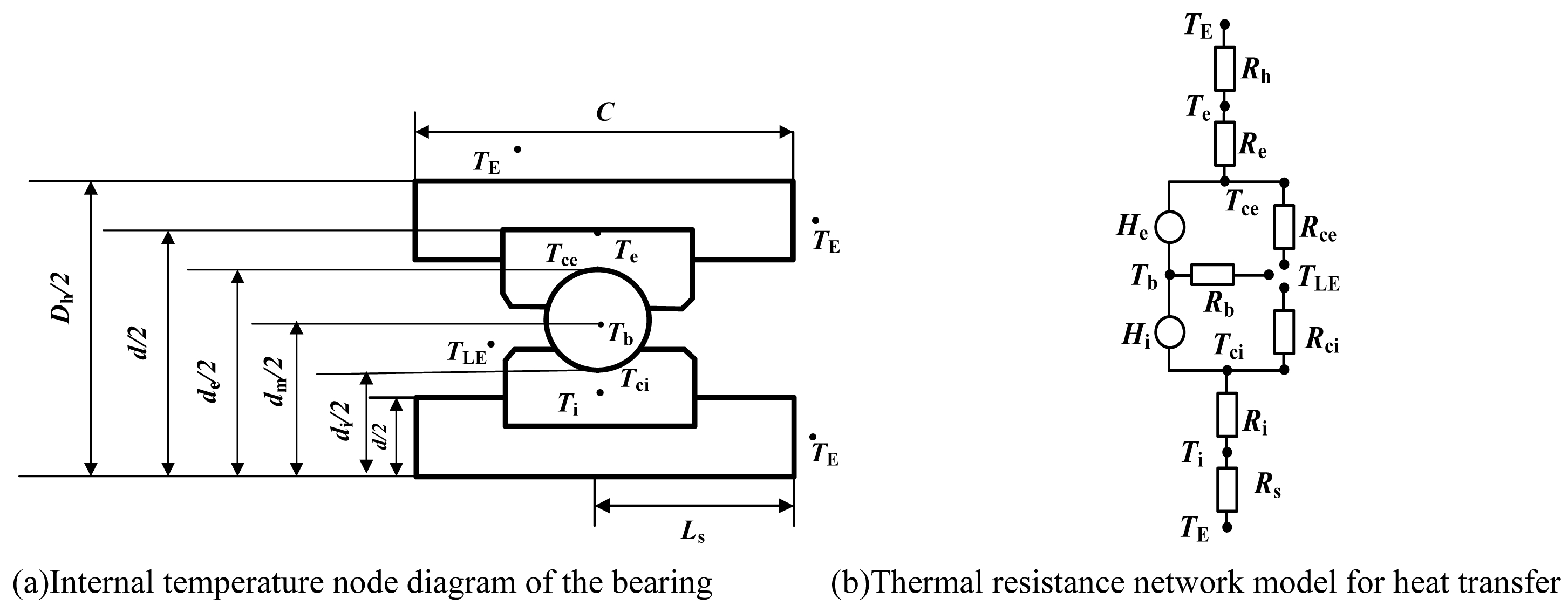 Where Tci is the surface temperature of the inner raceway; Tce is the surface temperature of the outer raceway; TE is the ambient temperature outside the bearing; TLE is the air temperature inside the bearing; Tb is the temperature of the rolling element; Ti is the inner surface temperature of the inner ring; Tc is the outer surface temperature of the outer ring; Ri is the thermal resistance of the inner ring; Re is the thermal resistance of the outer ring; Rci is the convective thermal resistance of the inner raceway surface; Rce is the convective thermal resistance of the outer raceway surface; Rb is the convective thermal resistance of the rolling element surface; Rs is the thermal resistance of the shaft; and Rh is the thermal resistance of the bearing housing.