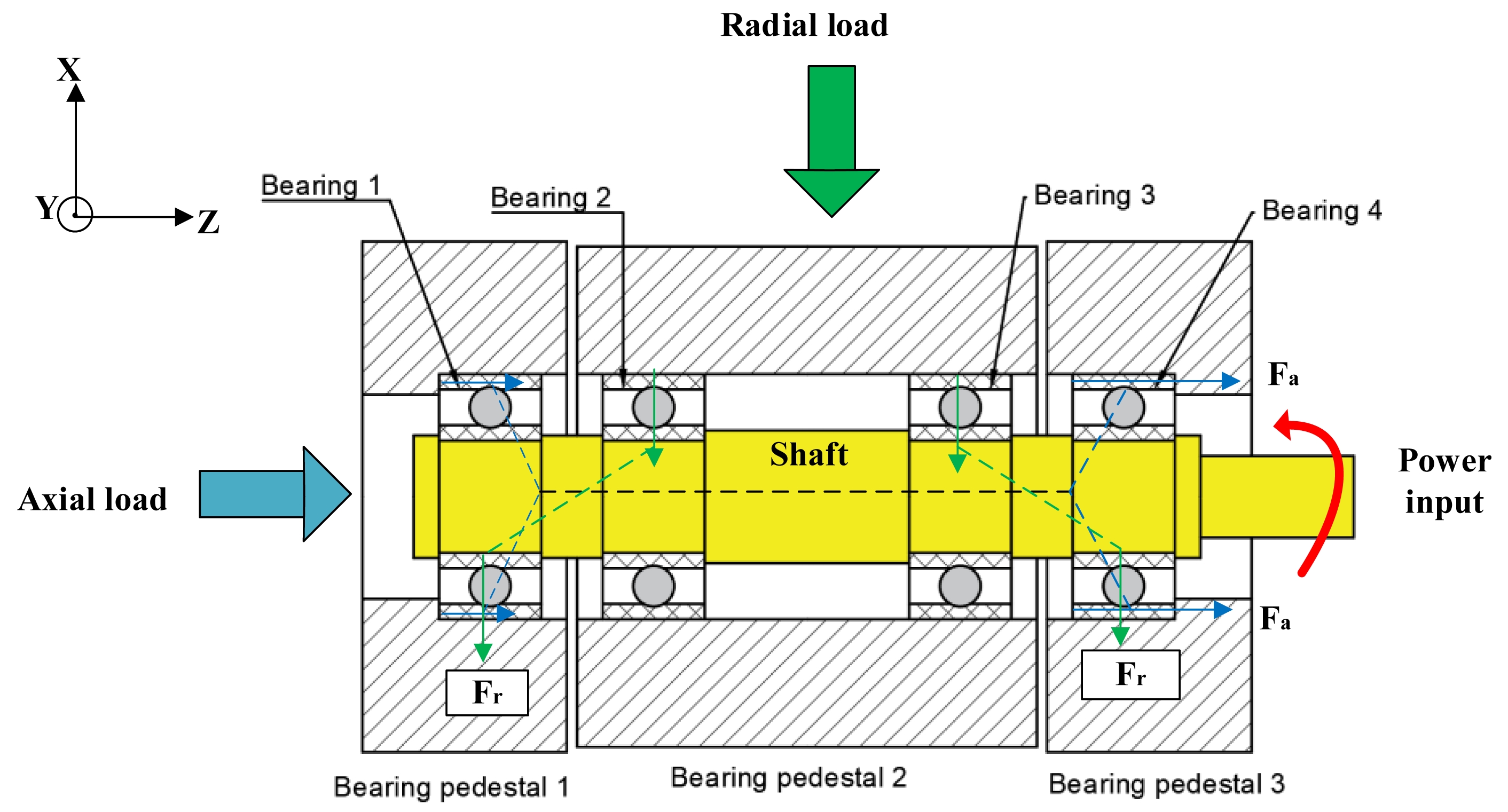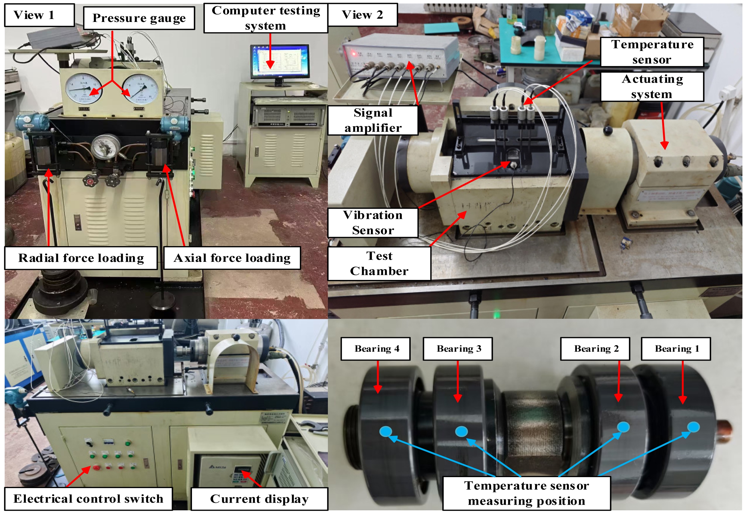 In order to study the full life thermal characteristics of full ceramic ball bearings, an ABLT-1A bearing life enhancement testing machine was used in this experiment, the main structure of which is shown in Fig. 4. The machine's radial load range is 0-30KN, and the maximum spindle speed is 18,000 r/min (when driven by the electric spindle, the speed is not less than 3,000 r/min). The motor is connected to the shaft via a coupling, and the motor speed can be independently set by a computer detection system. On the left side of the testing machine, there is a radial (axial) loading device, which allows the bearing to be loaded. The load application system supports independent or combined radial (Fr) and axial (Fa) loading modes. The load adjustment is achieved through a counterweight on the scale plate on the left side of the test bench. The mechanical transmission path is as follows: when axial load is applied to the test bearing via the axial loading device, the Fa is initially applied to bearing seat 1 and transmitted through the interface between the bearing outer ring 1, rolling element, and inner ring to the shaft system, which then acts on the associated bearing components. When radial load is applied to the test bearing via the radial loading device, the Fr is initially applied to bearing seat 2, and transmitted through test bearings 2 and 3 to the drive shaft system. The next stage distributes the load to test bearings 1 and 4 via the shaft structure. All four bearings in the test chamber are subjected to radial load, and the specific structure and stress analysis of the test chamber are shown in Fig. 5. The test system is equipped with a single-channel vibration monitoring unit (placed on the outside of the test chamber) and a four-channel temperature collection module (Bearing1-Bearing4), with spatial positioning shown in Fig. 4 (View 2). The temperature sensors are contact-mounted and pass through precision holes in the bearing seats to form a thermal conduction path with the corresponding bearing outer rings, enabling real-time monitoring of the surface temperature distribution on the outer rings. Bearings 1 to 4 correspond to the temperature parameters of the test bearings 1 to 4. By processing the temperature and vibration sensor signals (with the temperature sensors measuring the outer ring temperature) through amplifiers, real-time test data are recorded in the computer detection system for further analysis.
