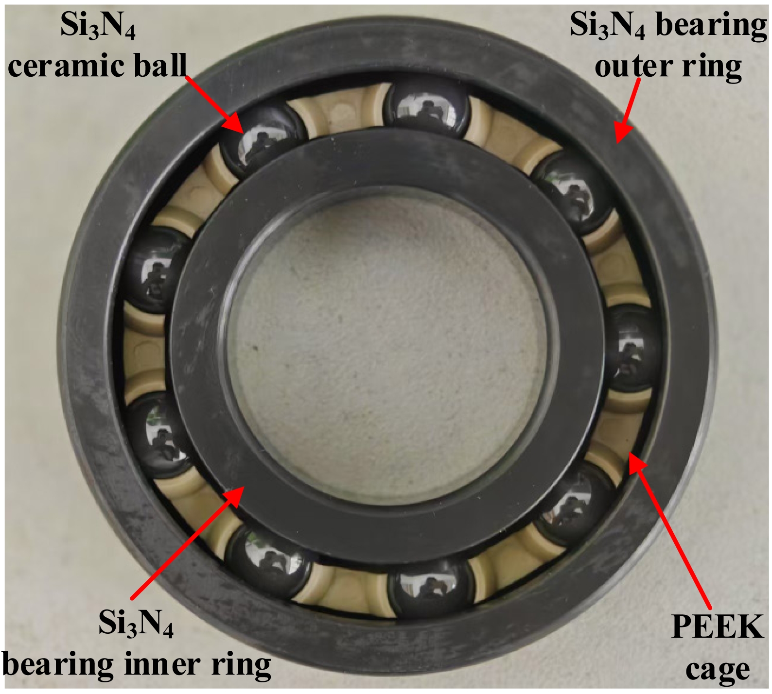 In this experiment, four 6206 silicon nitride full ceramic deep groove ball bearings from the same production batch were used. A full ceramic silicon nitride bearing refers to a bearing in which the inner ring, outer ring, and rolling elements are all made from silicon nitride ceramic material, while the cage is made of PEEK, as shown in Fig. 6. The four bearings were mounted together on the same shaft, with their installation positions illustrated in Fig. 5. The bearings in the test rig operated without lubrication. A radial load of Fr = 3.35 KN was applied, and the rotational speed was set to nr = 8000 r/min. This rotational speed falls within the common operating range of high-speed spindles and grinding applications, which not only reflects the thermal characteristics under practical working conditions but also ensures experimental safety and stability.