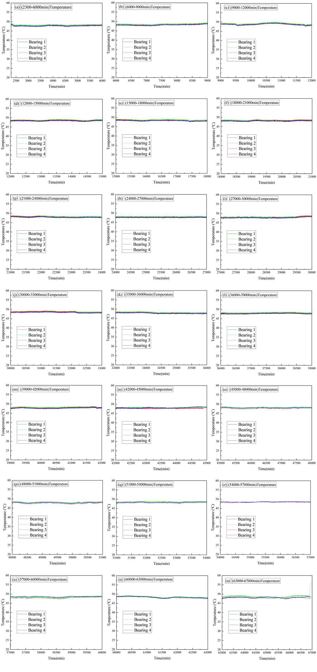 A total of 66,866 data points were collected during the experiment. To better observe the trend of temperature variation over time, bearing temperature curves were plotted at intervals of every 3,000 minutes. The entire full life bearing test can be divided into three distinct stages: the initial run-in stage, the steady operation stage, and the bearing failure stage.