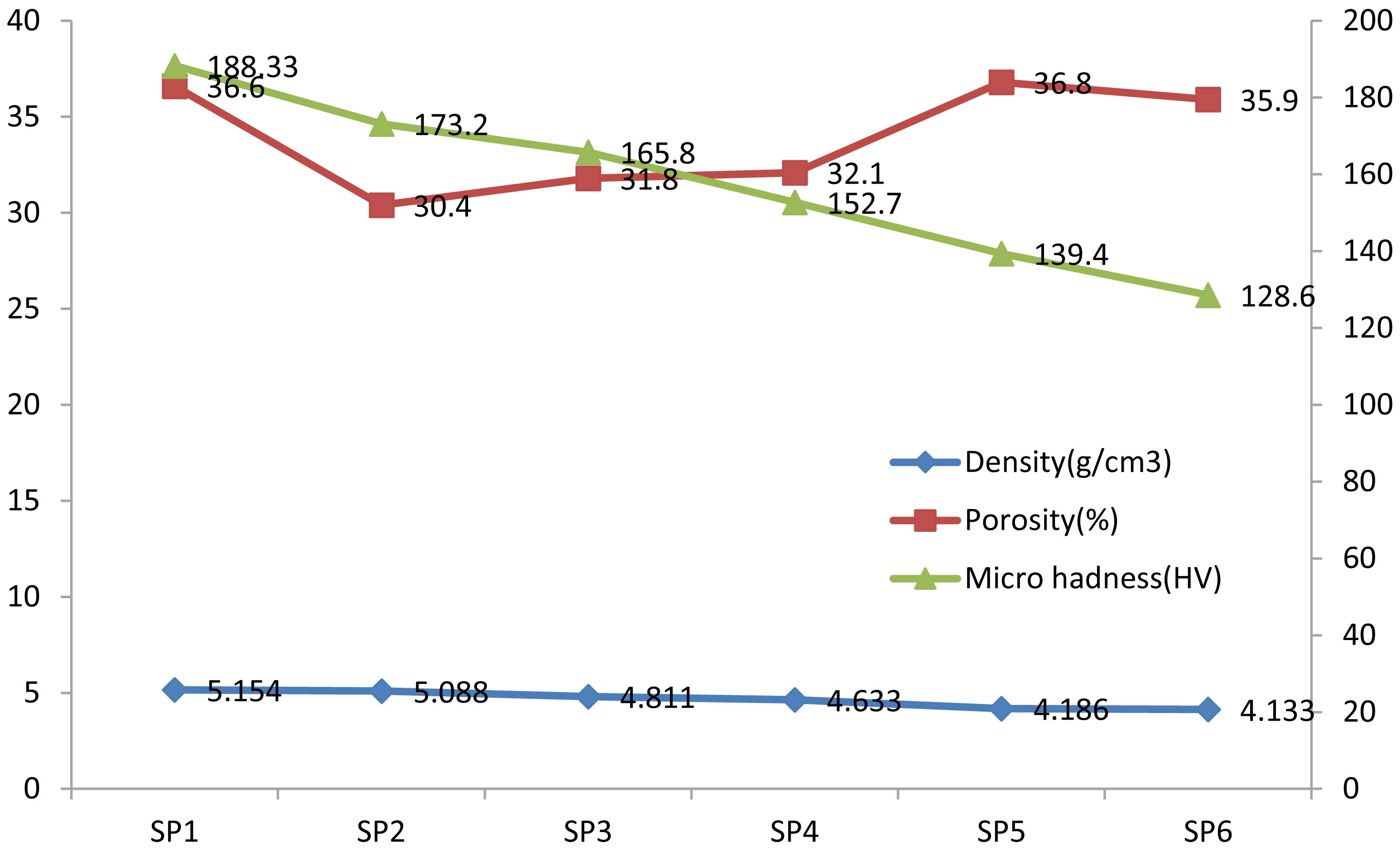 Fig. 1 Density, Porosity and Microhadness curves. |