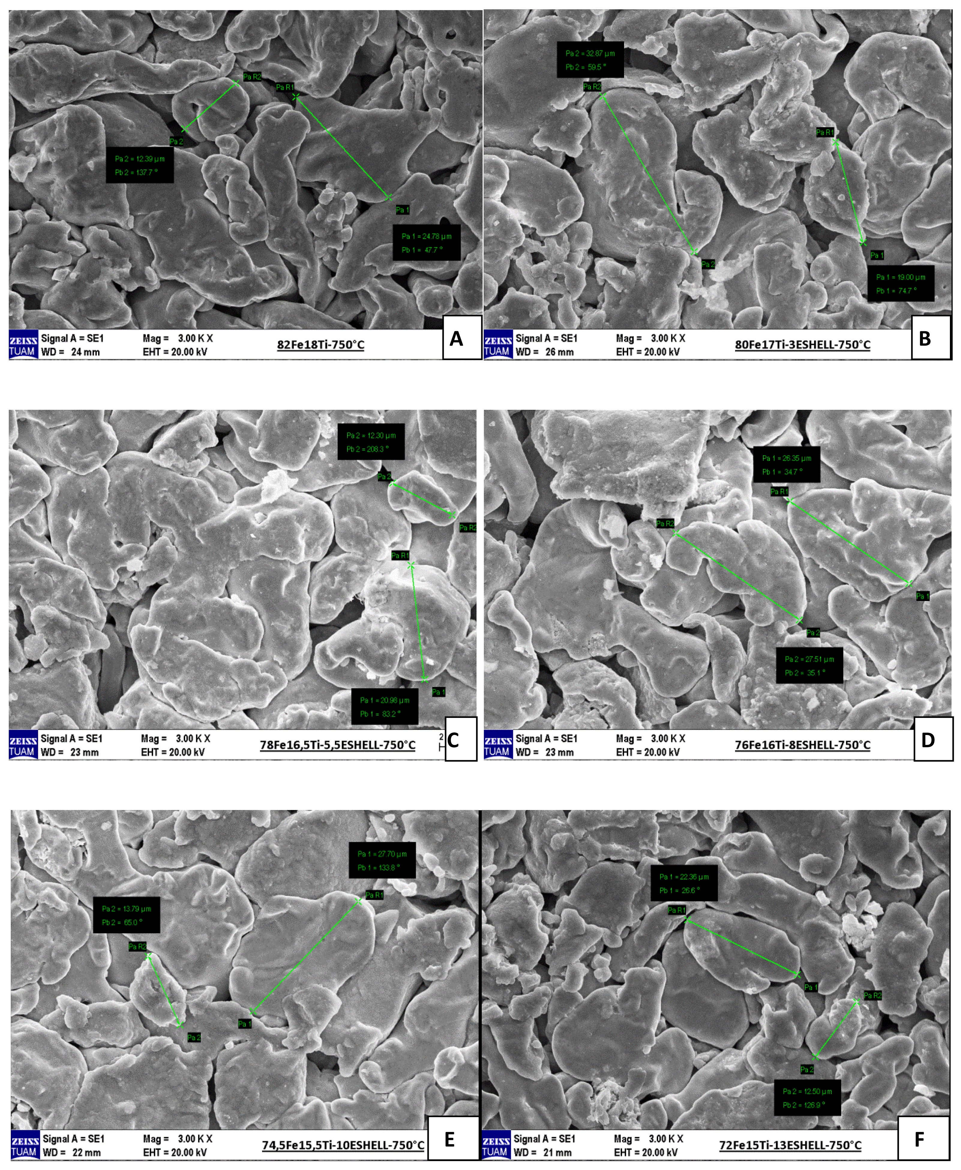 The SEM micrographs of Fe-Ti composites containing varying amounts of eggshell powder and sintered at 750 °C under an argon atmosphere reveal notable differences in microstructural characteristics (Fig. 2). In the sample without eggshell reinforcement (82Fe–18Ti), a relatively dense and compact microstructure with well-bonded particles is observed, indicating effective sintering and minimal porosity. As the eggshell content increases, beginning with the 3% addition (80Fe–17Ti–3%Eggshell), slight increases in pore formation and particle boundaries become evident. With further additions of 5.5% and 8% eggshell (Figures C and D), the microstructure displays more pronounced porosity and weakened interparticle bonding, suggesting that excessive bioceramic content interferes with densification. At higher reinforcement levels of 10% and 13% (Figures E and F), the micrographs reveal substantial pore presence and particle separation, with clear signs of agglomeration and incomplete sintering. These structural degradations correlate directly with the observed reductions in density and microhardness, indicating that high eggshell content adversely affects the mechanical integrity of the composites. Consequently, while eggshell offers benefits as a lightweight and eco-friendly additive, its proportion must be carefully optimized to preserve microstructural cohesion and ensure satisfactory performance.