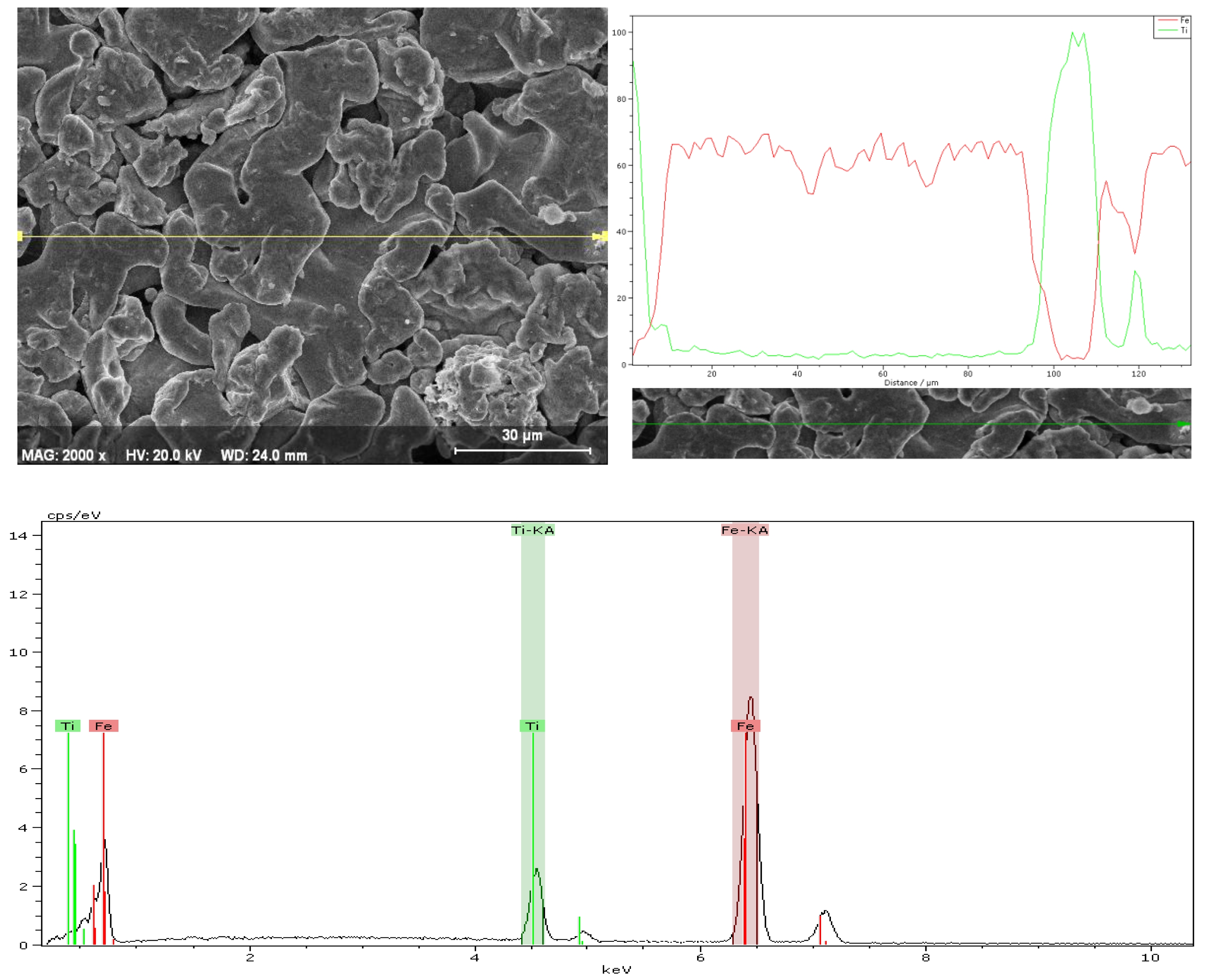 The EDX analysis of the SP1 sample sintered at 750 °C provides insights into both the elemental composition and distribution of the material (Fig. 3). The SEM micrograph at 2000× magnification reveals an irregular and porous microstructure with micron-sized particles. The line scan performed along the marked line demonstrates the spatial distribution of Fe and Ti elements. The Fe signal (red line) is relatively uniform across the scanned area, indicating that iron is the dominant and continuous phase in the microstructure. In contrast, the Ti signal (green line) shows localized peaks, suggesting that titanium is concentrated in specific regions rather than being homogeneously dispersed. The corresponding EDX spectrum confirms the presence of Fe and Ti as the major elements, with prominent Fe-Kα and Ti-Kα peaks. The relatively higher intensity of the Fe peaks compared to Ti indicates that Fe is the primary constituent, while Ti appears in lower quantities and is likely present as discrete particles or segregated phases. This localized enrichment of Ti may influence the mechanical and surface properties of the sintered composite, potentially contributing to variations in hardness or wear resistance across the surface.