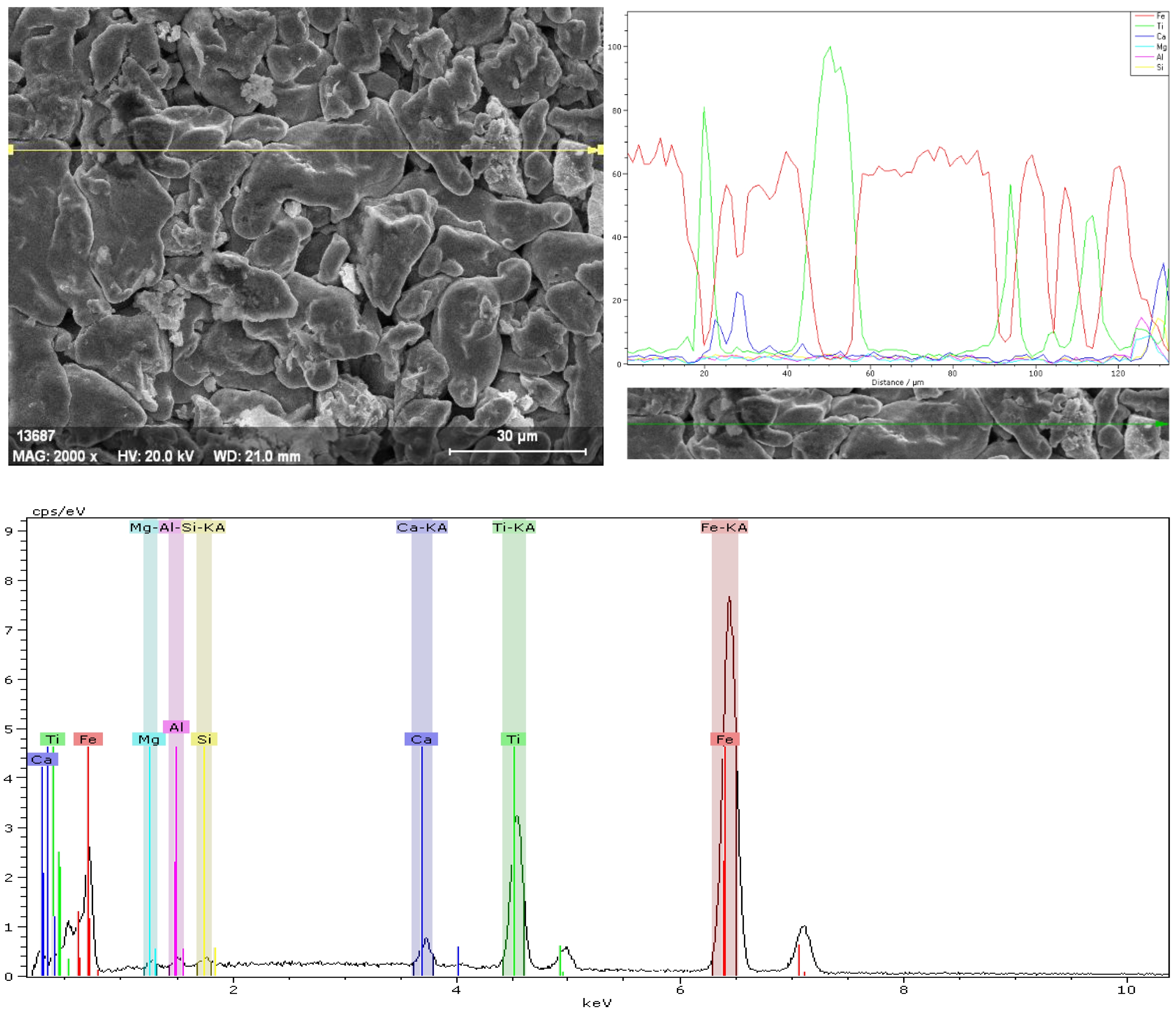 The EDX analysis of the SP6 sample sintered at 750 °C reveals detailed information regarding the elemental composition and distribution within the composite (Fig. 4). The SEM micrograph at 2000× magnification shows an irregular and porous microstructure with closely packed particles, consistent with sintered metallic composites. The line scan along the marked yellow line illustrates the spatial distribution of Fe, Ti, Ca, Mg, Al, and Si across the sample surface. Fe (red line) exhibits a relatively uniform distribution, indicating its role as the primary matrix element. Ti (green line) shows localized intensity peaks, suggesting its presence as discrete particles or segregated regions rather than being homogeneously dispersed. Minor elements such as Ca (blue line), Mg, Al, and Si appear in smaller quantities, with their signals presenting intermittent peaks along the scanned path, which indicates their localization at specific sites, likely corresponding to secondary phases or inclusions.