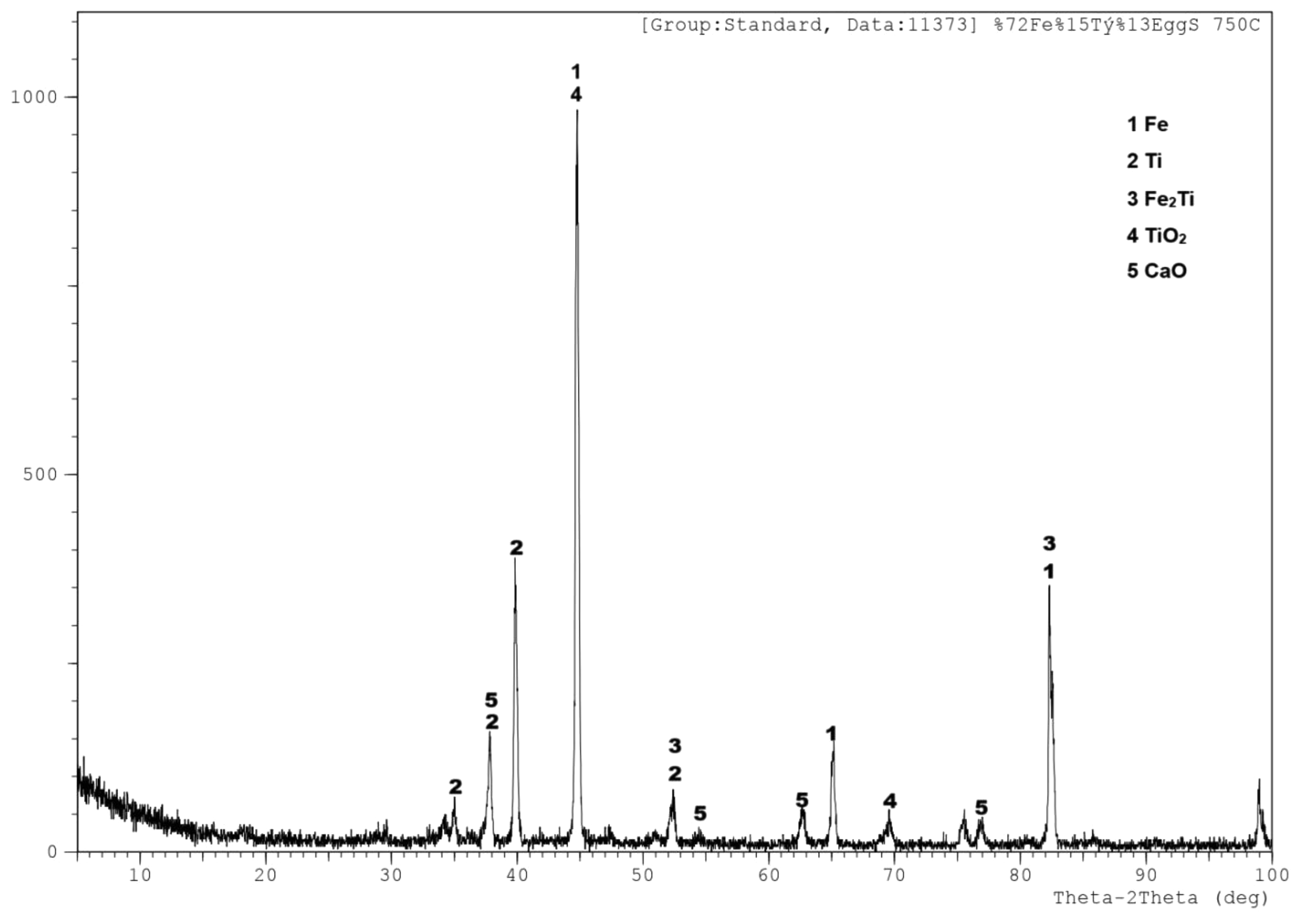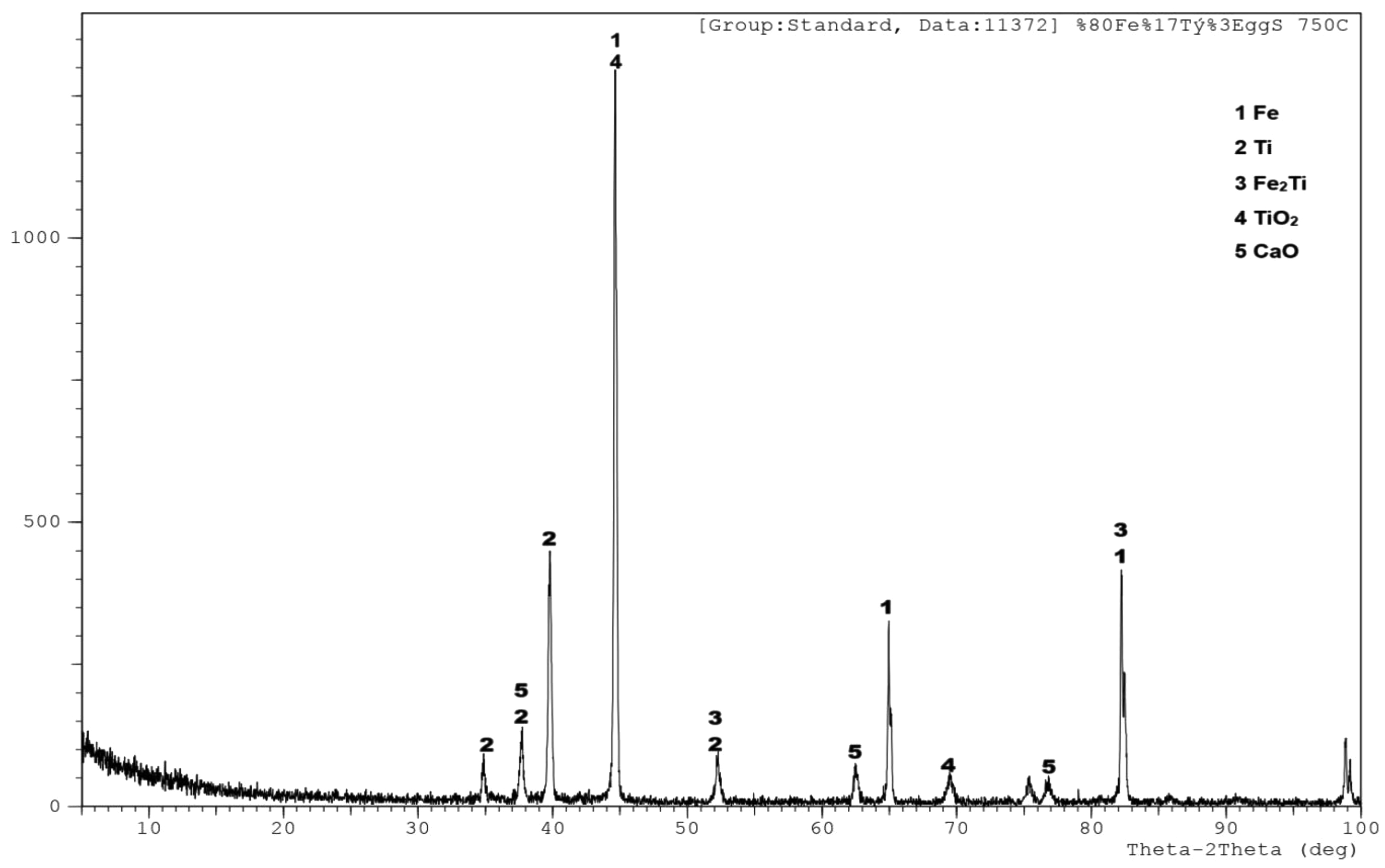 Fig. 6 XRD analysis of sample (%80Fe-%17Ti-%3EggShell) sintered at 750 ºC. |