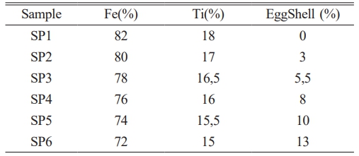 Six different compositions were prepared with varying weight percentages of Fe, Ti, and EggShell, as summarized in Table 1.