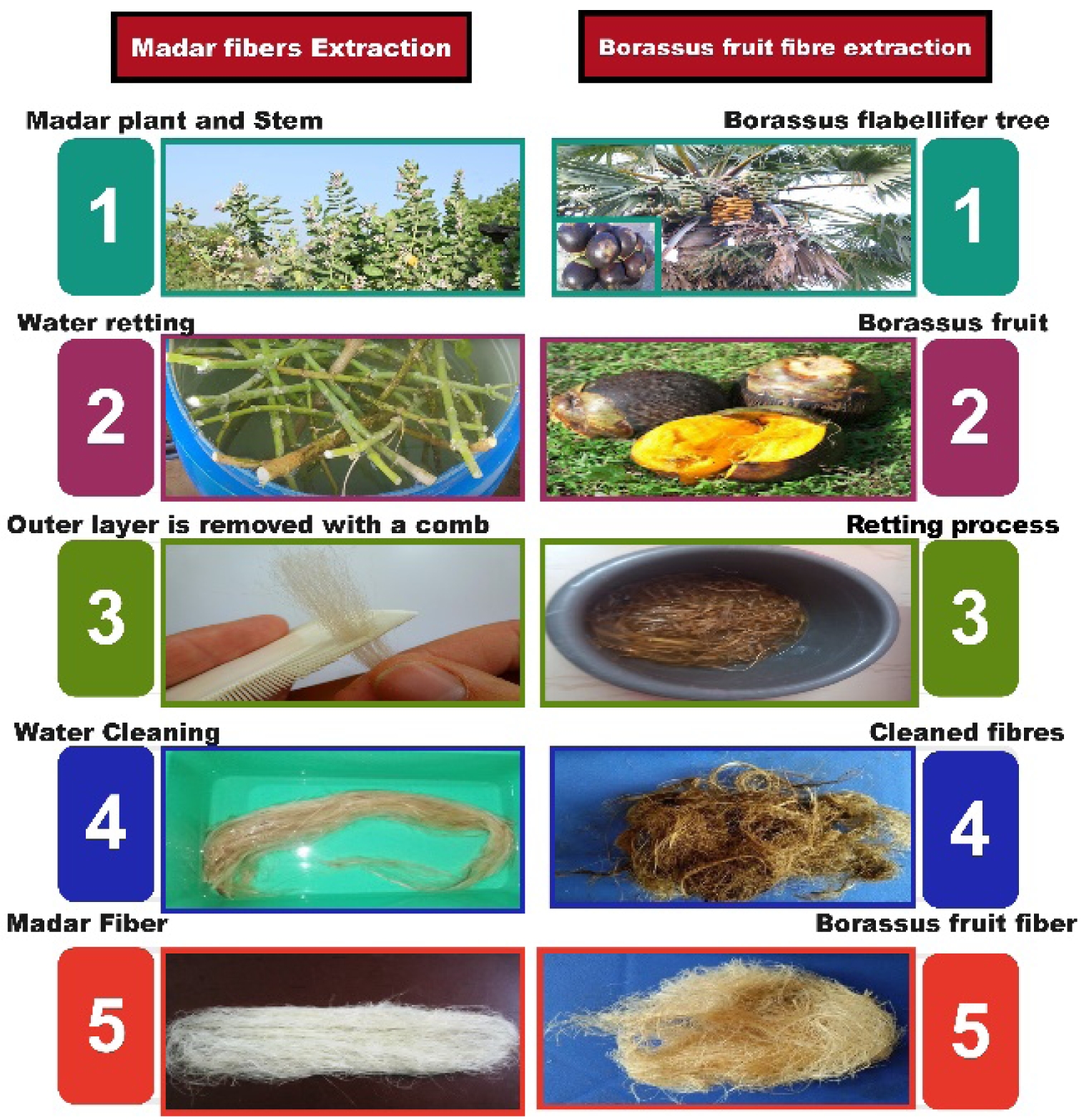 The fibers are extracted from the outer layer of the Borassus fruit and separated from the fruit through the retting process. Consequently, the filaments were removed after immersion in water to promote their disintegration. Initially, researchers extracted the pure fibers and subsequently dehydrated them for 48 hours. The impact of variance was reduced by extensively homogenizing the fibers following the extraction. Consequently, the unprocessed Borassus fruit fiber was obtained [20]. Fig. 1 illustrates the extraction method of fiber from the Madar plant and Borassus tree.