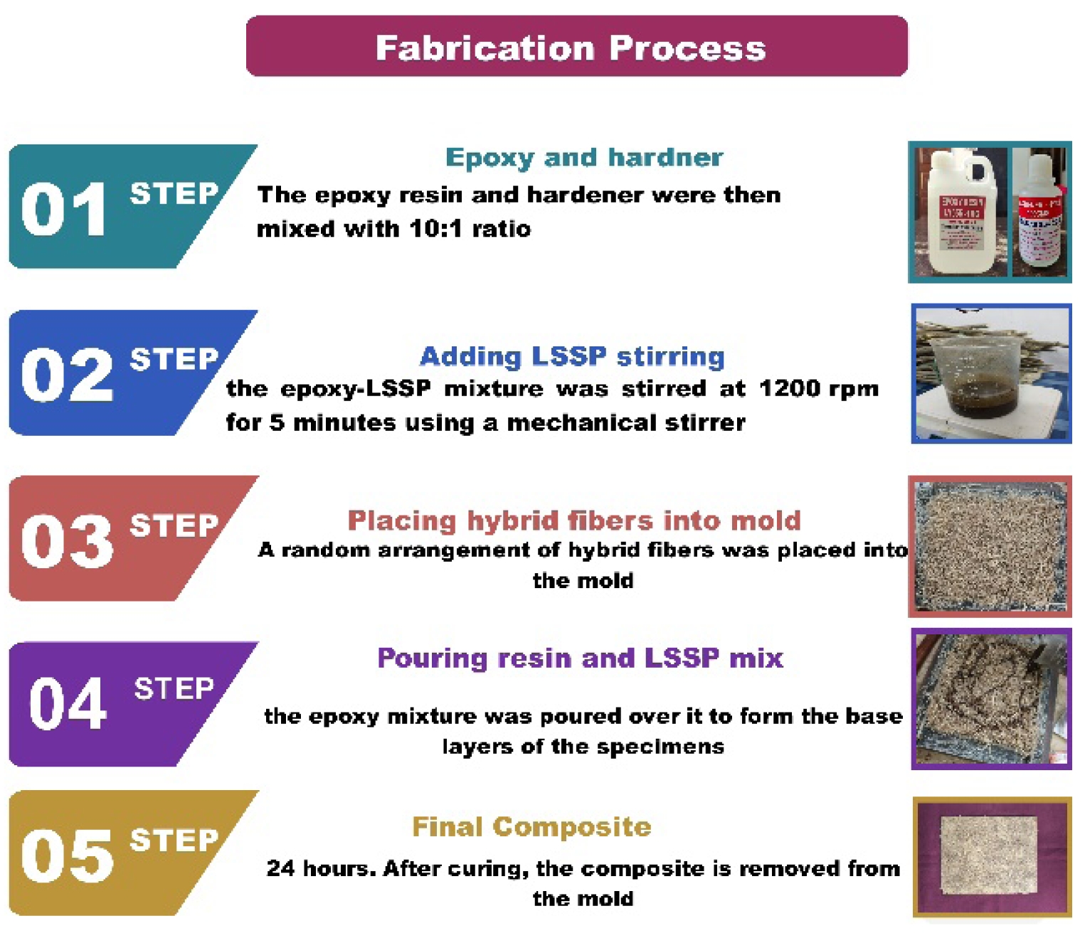 The integration of MF and BFF (hybrid fibers) with an epoxy resin matrix was varied from 0 to 12 wt% to produce composite prototypes. The hand lay-up technique was employed for the fabrication of the composites. MF and BFF reinforced epoxy hybrid composite specimens were manufactured using different LSSP particle compositions. The wax was initially applied to the mold, which served as a release agent, and had the dimensions of 300 × 250 × 3 mm. The epoxy resin and hardener were then mixed with 10:1 ratio according to the manufacturer’s instructions. The hardener acts as a curing agent for anhydrous bases. After the epoxy and hardener was thoroughly mixed, the LSSP was incorporated into the epoxy matrix. To prevent agglomeration due to the chemical reaction, the epoxy-LSSP mixture was stirred at 1200 rpm for 5 minutes using a mechanical stirrer. The mold surface was then coated with epoxy resin. A random arrangement of hybrid fibers was placed into the mold, and the epoxy mixture was poured over it to form the base layers of the specimens. The composite was compressed using an additional steel plate, which was covered with plastic to prevent adhesion to the mold. The specimen was allowed to cure at ambient temperature for 24 hours. After curing, the composite is removed from the mold. The mold is subsequently cleaned in preparation for the next fabrication cycle, following as per ASTM standards. The weight percentage of each fiber were varied from 0 to 12 wt%. The amount of epoxy required to fill the mold was calculated based on the weight of the fibers and binder used for each sample. Fig. 2 illustrates the composite fabrication process.
