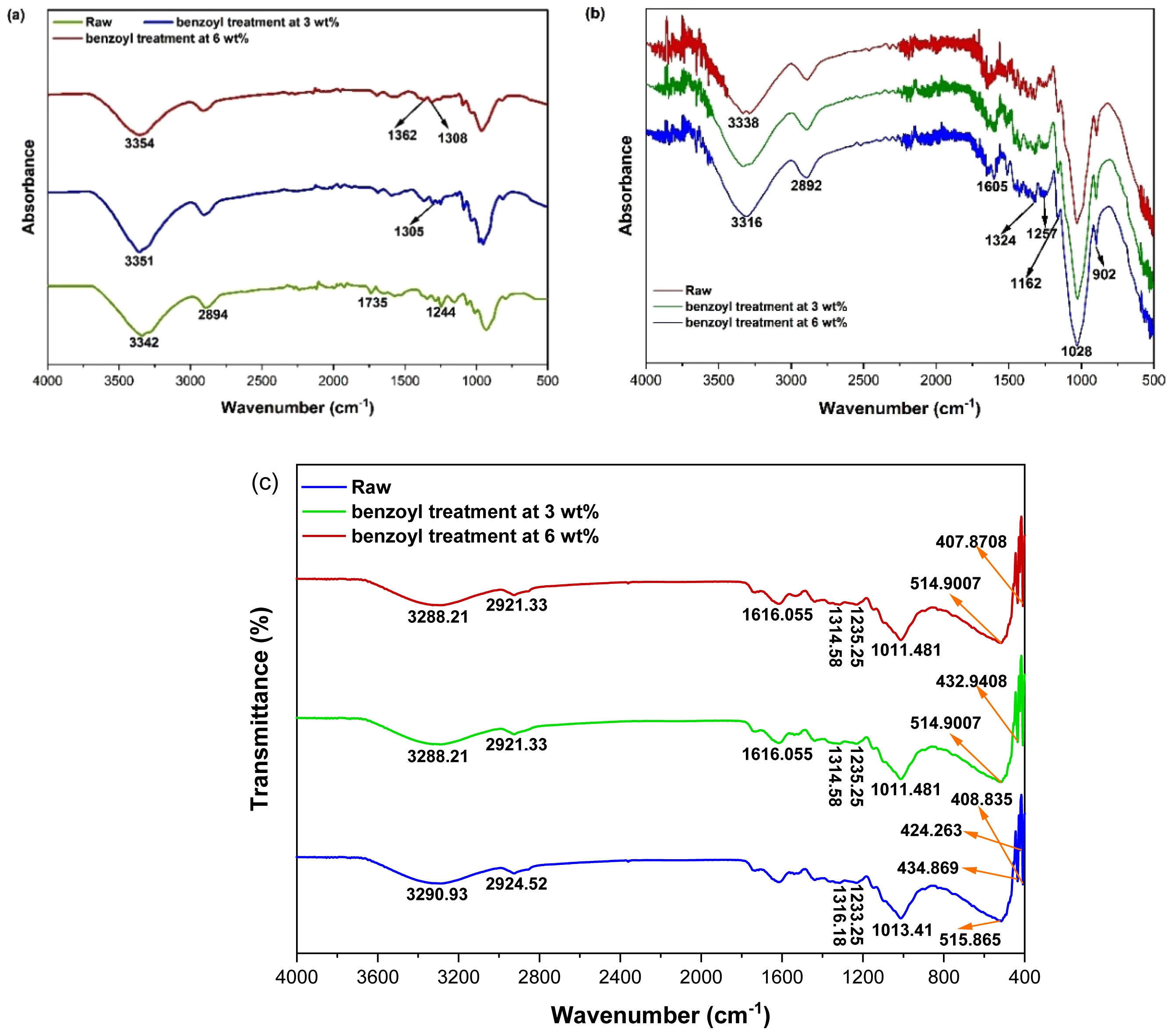 Figure 5(b) shows the FTIR spectra of raw and benzoylated BFF illustrating changes in chemical structure and functional groups due to benzoylation at 3 wt% and 6 wt%. A strong absorption band at 3338 cm⁻¹ in the raw fiber is due to O–H stretching vibrations of intermolecular hydrogen bonds in hemicellulose and cellulose. The 2892 cm⁻¹ peak arises from C–H stretching in aliphatic chains. The band at 1605 cm⁻¹ corresponds to aromatic C=C stretching in lignin, while the peaks at 1324 cm⁻¹ and 1257 cm⁻¹ are due to C–O and aryl-ether vibrations, respectively. A peak at 902 cm⁻¹ confirms the presence of β-glycosidic linkages in cellulose. Upon benzoylation with 3 wt% and 6 wt% benzoyl chloride, a noticeable reduction in the O–H peak intensity (shifted to 3316 cm⁻¹) indicates substitution of hydroxyl groups by esterification. Enhanced peaks at 1324 cm⁻¹, 1257 cm⁻¹, and 1162 cm⁻¹ suggest aromatic ring vibrations, confirming successful benzoyl group incorporation. A new peak at 1028 cm⁻¹ reflects changes in C–O and C–O–C stretching regions. These modifications confirm successful surface functionalization, particularly at 6 wt%, which improves hydrophobicity and enhance the fiber–matrix bonding in composite applications.