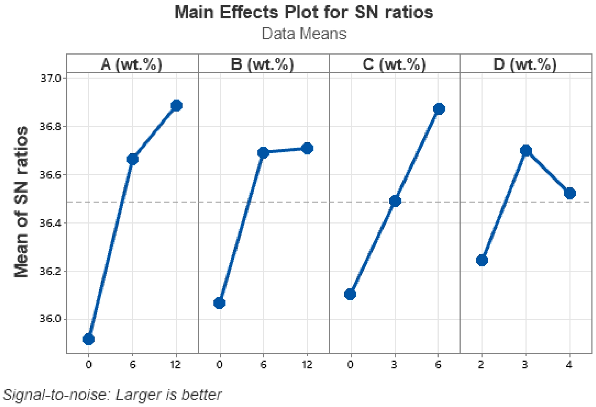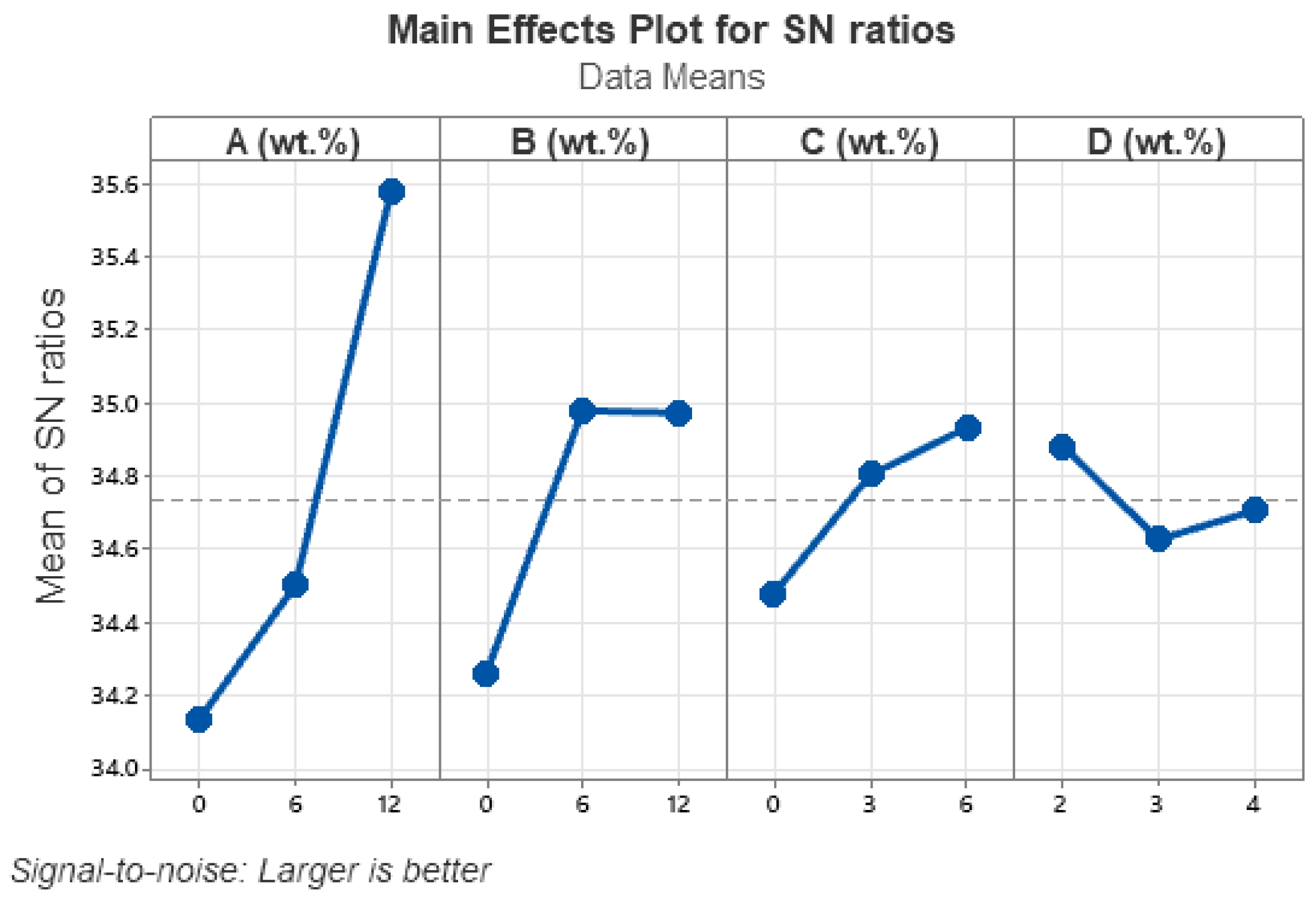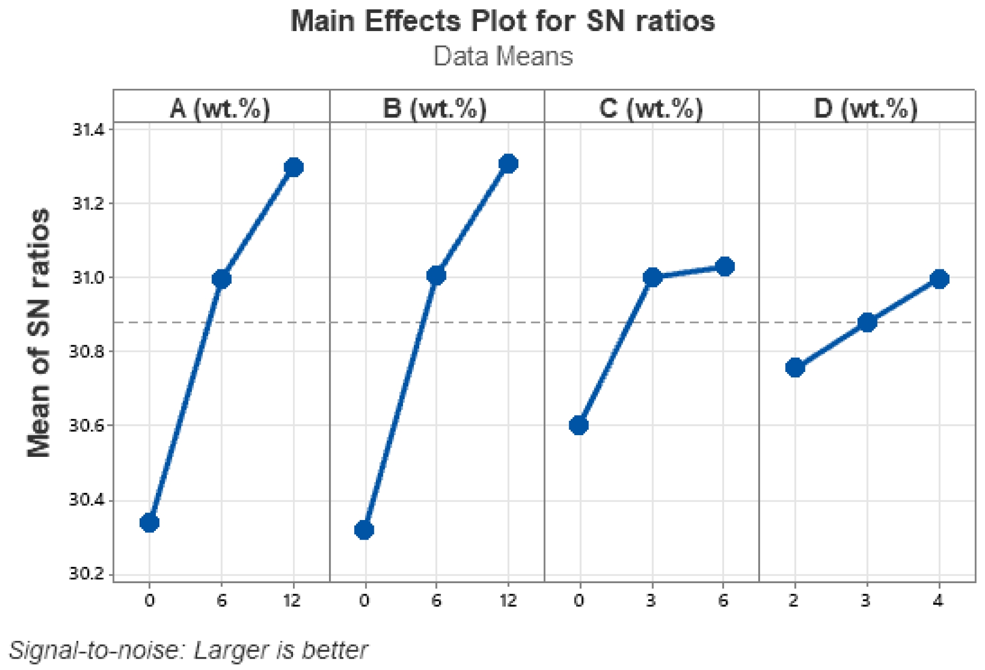 The tensile strength (TS) of the fabricated composites indicated that TS increased with the addition of BFF and MF. The reinforcing 12 wt% BFF, 12 wt% MF, 6 wt% BT, and 4 wt% LSSP demonstrated the optimal TS values. The use of fibers improved the TS of the fabricated composites. The integration of BFF and MF within an optimal range enhanced the tensile characteristics of the hybrid composites. The signal-to-noise (S/N) ratios of BFF and MF increased from 31 to 31.3 and from 31 to 31.31, respectively by adding upto 12 wt% of each fiber as shown in Fig. 6.