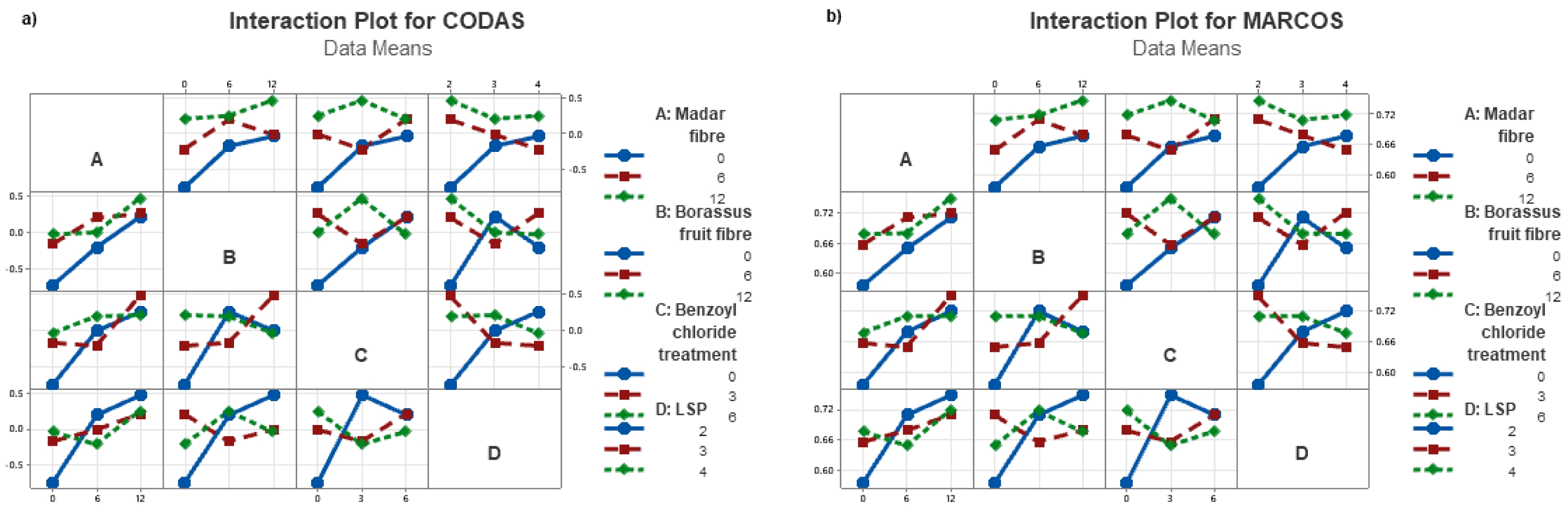 Fig. 9 illustrates the interaction plot of the evaluation score (derived from CODAS) and f(ki) (derived from MARCOS) revealing a similar trend present in the MARCOS data. A comparable MARCOS approach was employed in other studies on natural fiber-reinforced composites for optimization.