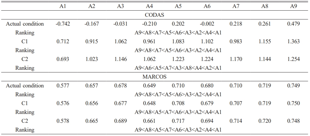 The normalization of the data was executed by using eq. (3). The standard deviations (sj) for each criterion are presented in Table 3 and it was computed using eq. (4). Eq. (6) was employed to determine the data measure values, as illustrated in Table 3. Subsequently, the criterion weights were calculated using eq. (7) and are presented in Table 3.