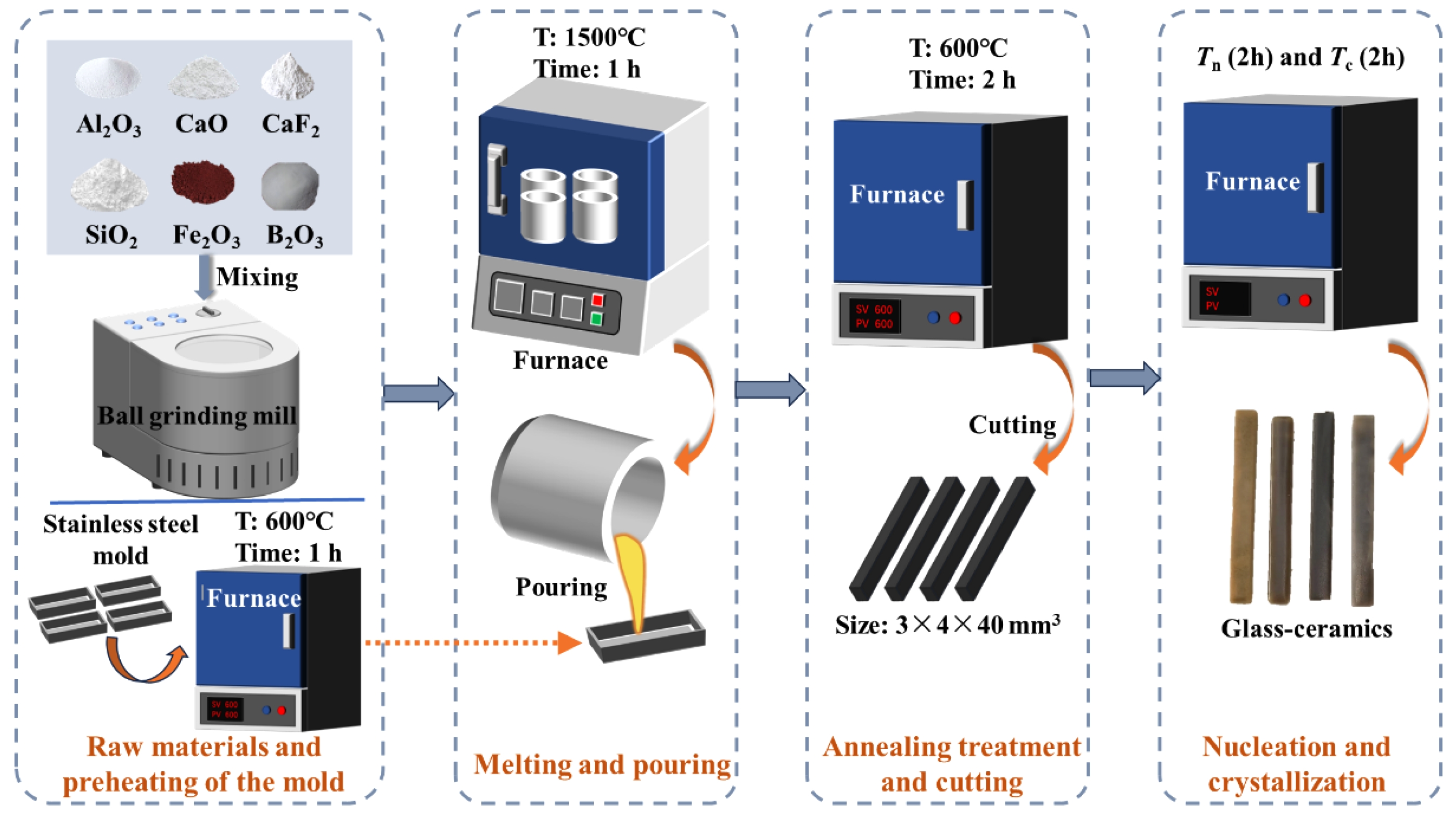 Based on the chemical composition of the base glass shown in Table 1, the accurately weighed raw materials were thoroughly mixed and sieved to a particle size of less than 74 μm. The mixture was then placed in a muffle furnace and heated to 1500 °C with a holding time of 1 h to ensure complete melting and homogenization. The molten slag was subsequently cast into a mold preheated at 600 °C for 1 h, followed by annealing in the same furnace at 600 °C for 2 h. After annealing, the base glass samples were cooled to room temperature along with the furnace. Finally, the samples were demolded, cut, ground, and polished to obtain base glass specimens with dimensions of 3 × 4 × 40 mm3. A portion of the base glass was crushed for differential thermal analysis, and the corresponding nucleation and crystallization temperatures were determined based on the DSC curves. Subsequently, an appropriate heat treatment schedule was established for the preparation of glass-ceramics. The specific preparation process is illustrated in Fig. 1.