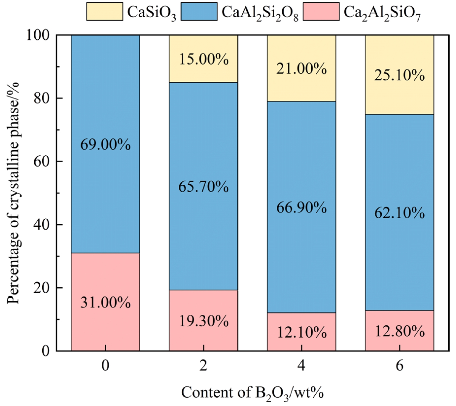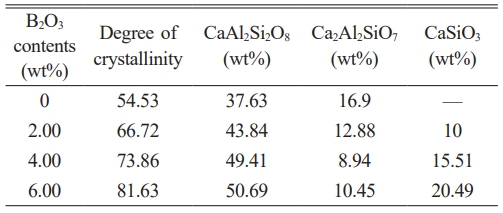Table 5 Crystallinity and content of crystal phases of glassceramics with different B2O3 contents. |
