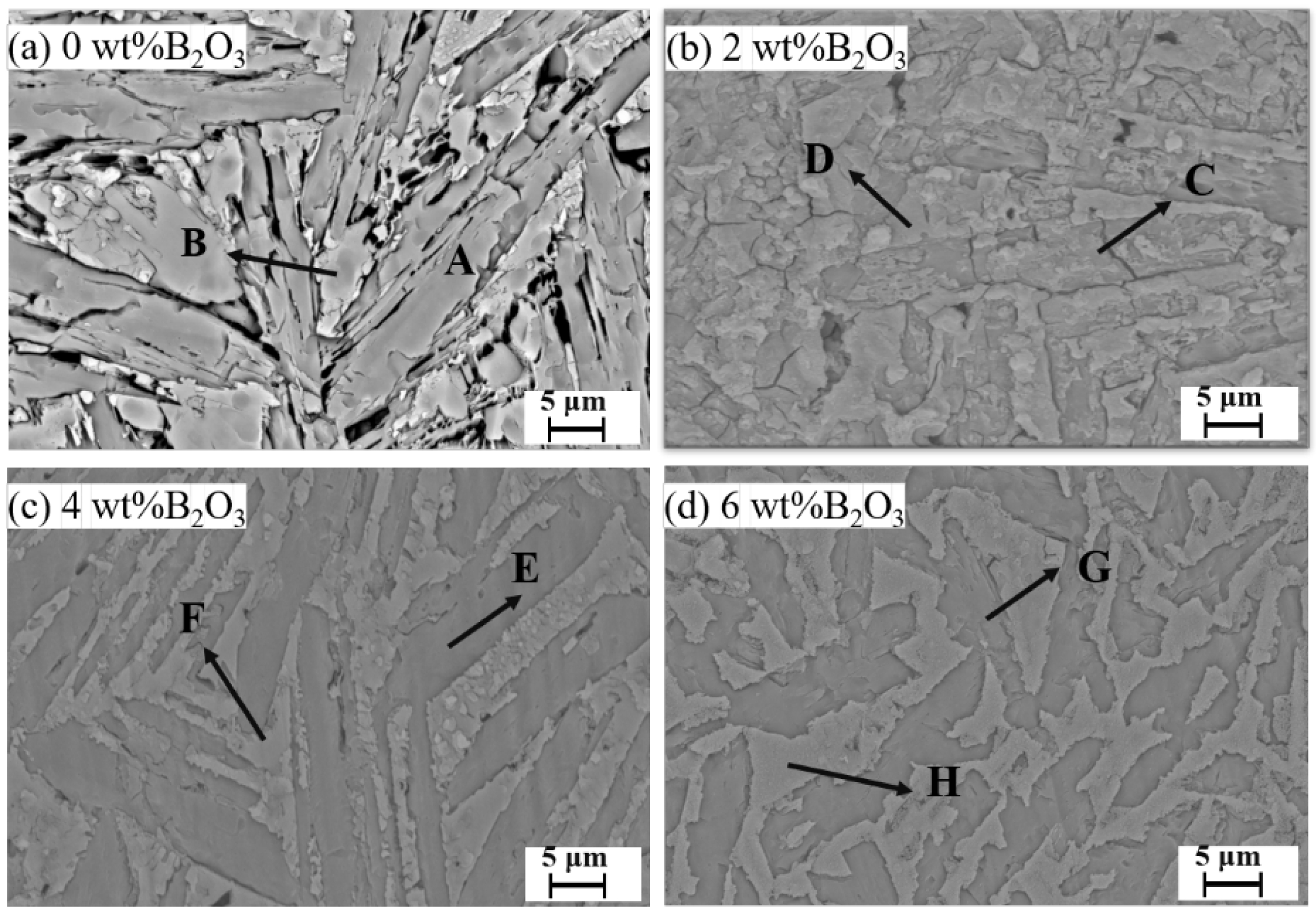 (1) The addition of B2O3 reduced the crystallization temperature of the glass-ceramics and promoted the crystallization process, shifting the crystallization mechanism from surface crystallization to bulk crystallization. The sample containing 6 wt% B2O3 exhibited the most favorable crystallization behavior.