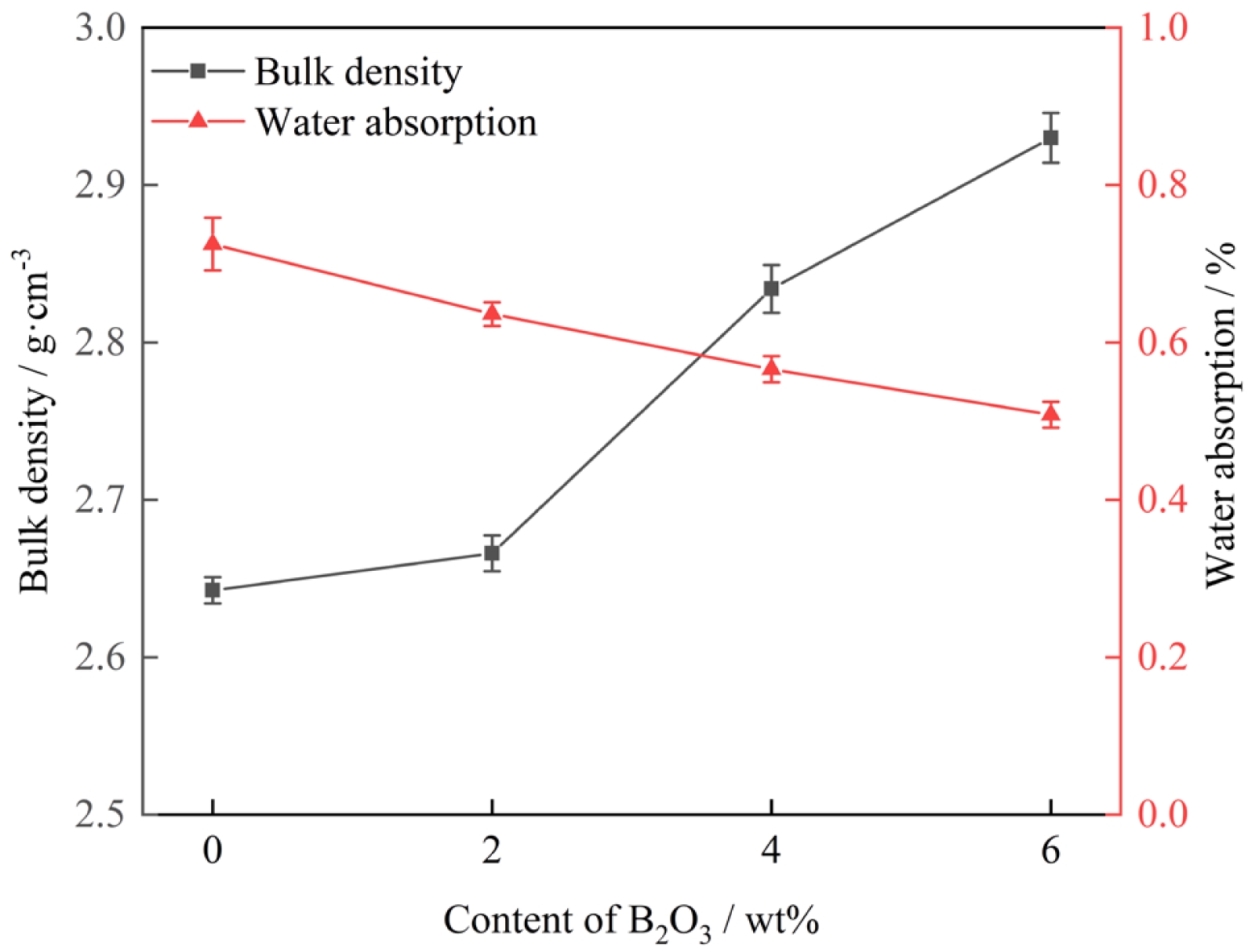 Fig. 7 Water absorption and bulk density of glass-ceramic samples with different B2O3 contents. |