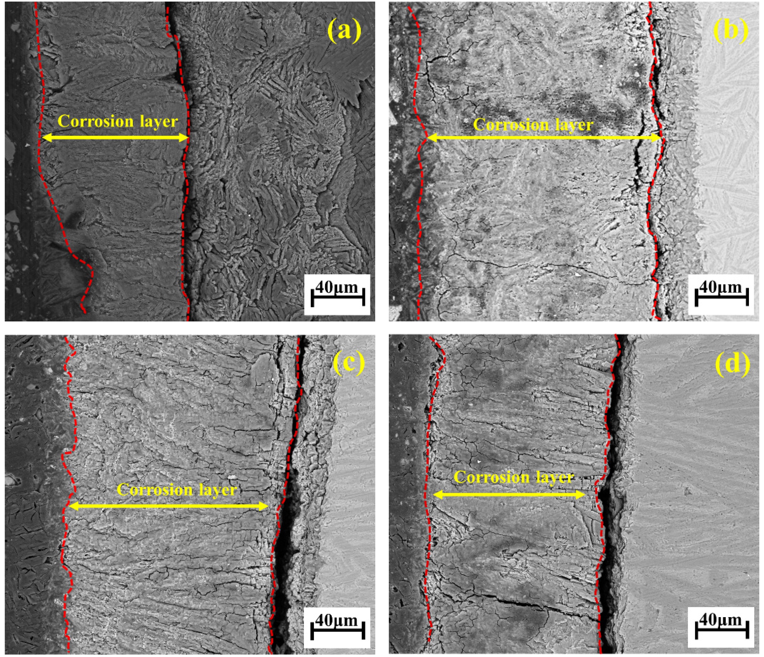 Fig. 12 shows the acid corrosion interface of the glass-ceramic samples. As observed under the electron microscope after polishing, a distinct corrosion layer appears on the surface of the samples subjected to acid solution attack. The thickness of the corroded boundary layer initially increases and then decreases. During the acid corrosion process, hydration reactions occur first, disrupting the glass network and generating micro-voids, which serve as pathways for SO42- ions to diffuse into the crystalline regions. This leads to the corrosion of the anorthite phase, resulting in stress imbalance within the crystal structure of the glass-ceramics, the formation of white particulate matter, cracking, and even exfoliation of the corroded layer as precipitates.