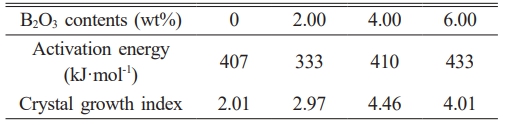 Table 3 Crystallization activation energy and crystal growth index of glass samples with different B2O3 contents. |