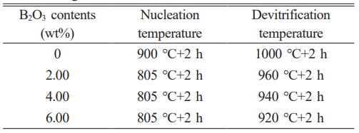 Table 4 Nucleation temperature and crystallization temperature of the base glass with different B2O3 contents. |