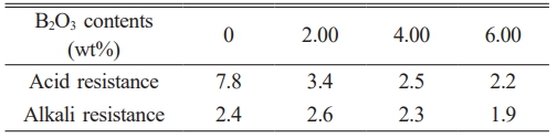 Table 7 Corrosion resistance of glass-ceramics with different B2O3 contents (%). |