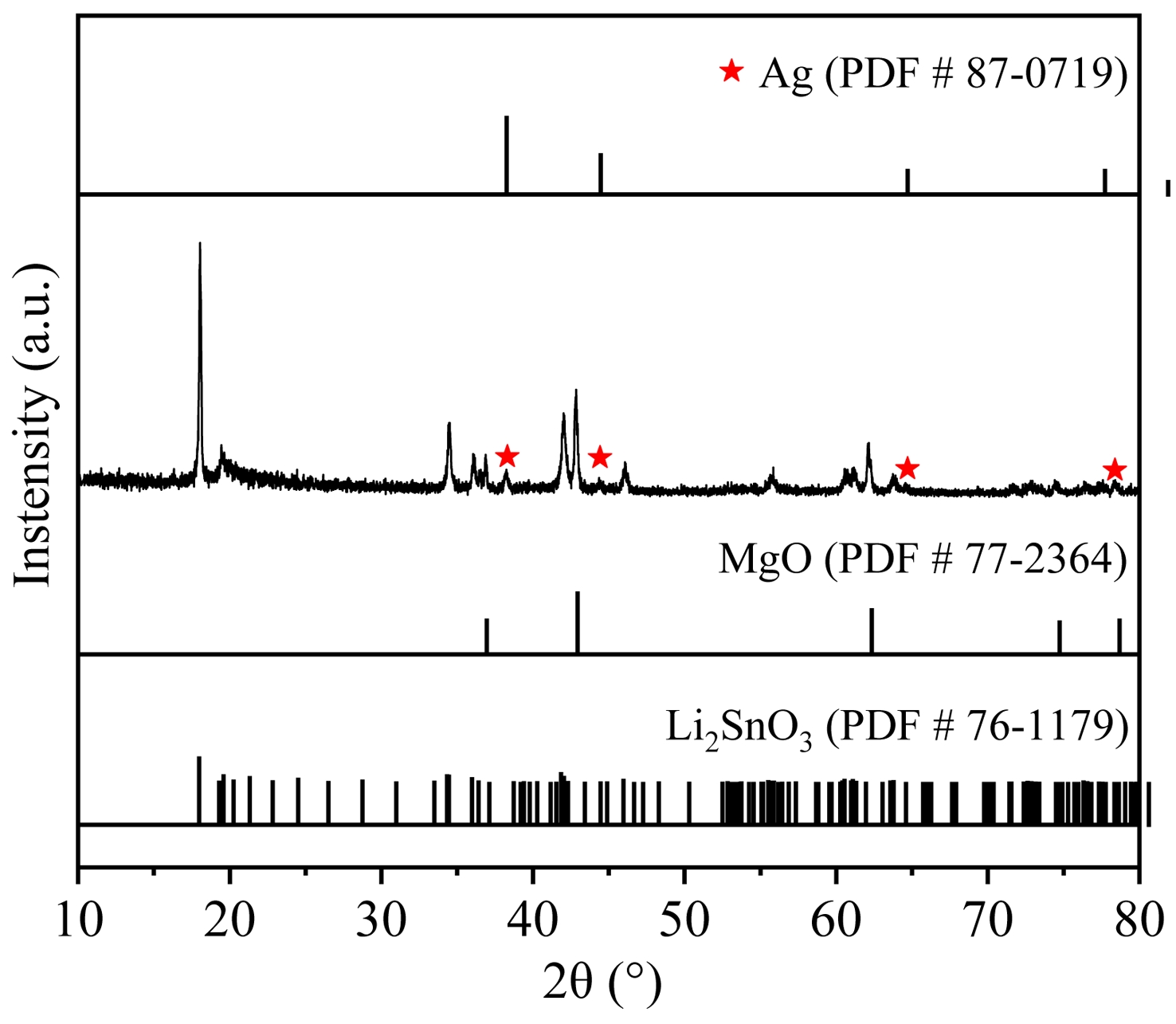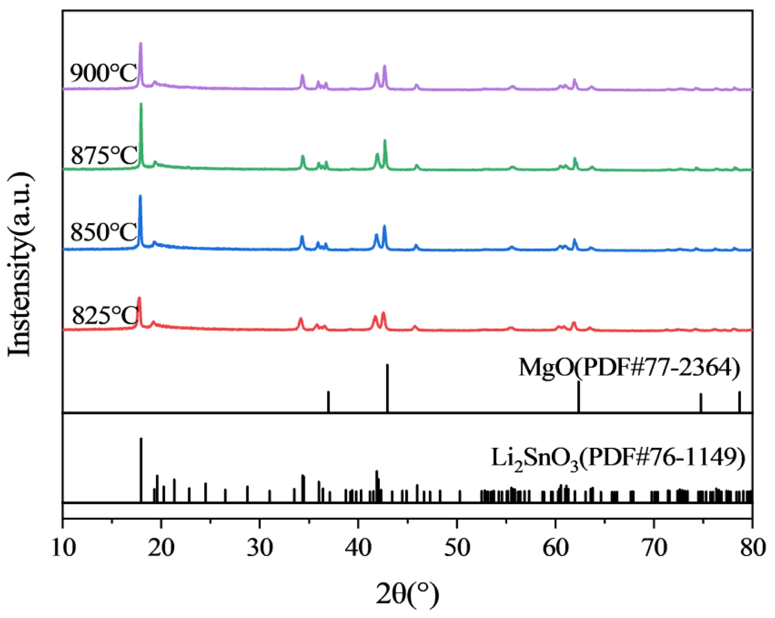 Through a solid-state process the (1-x)Li4Mg2SbO6F–xLi2SnO3 (x=0.65-0.85) (abbreviated as LMSOF-LSO) specimens were fabricated [15]. Based on stoichiometric Li4Mg2SbO6F and Li2SnO3, the initial materials of MgO, Li2CO3, LiF, Sb2O5, SnO2 (all purity >98.0%) were separately weighed, then were individually mixed via planetary milling for 9 h with anhydrous alcohol as medium. The dried Li4Mg2SbO6F and Li2SnO3 slurries were individually presintered under 550 oC/5 h and 950 oC/5 h. Subsequently, the LMSOF-LSO mixture powders were re-milled for 9 h. By adding 6 wt% PVA binder, the above mixture powders were granulated, and compacted into green discs with diameter of 10 mm and thickness around 4.5 mm. Finally, these discs were fired under 825 oC–900 oC for 5 h in air atmosphere.